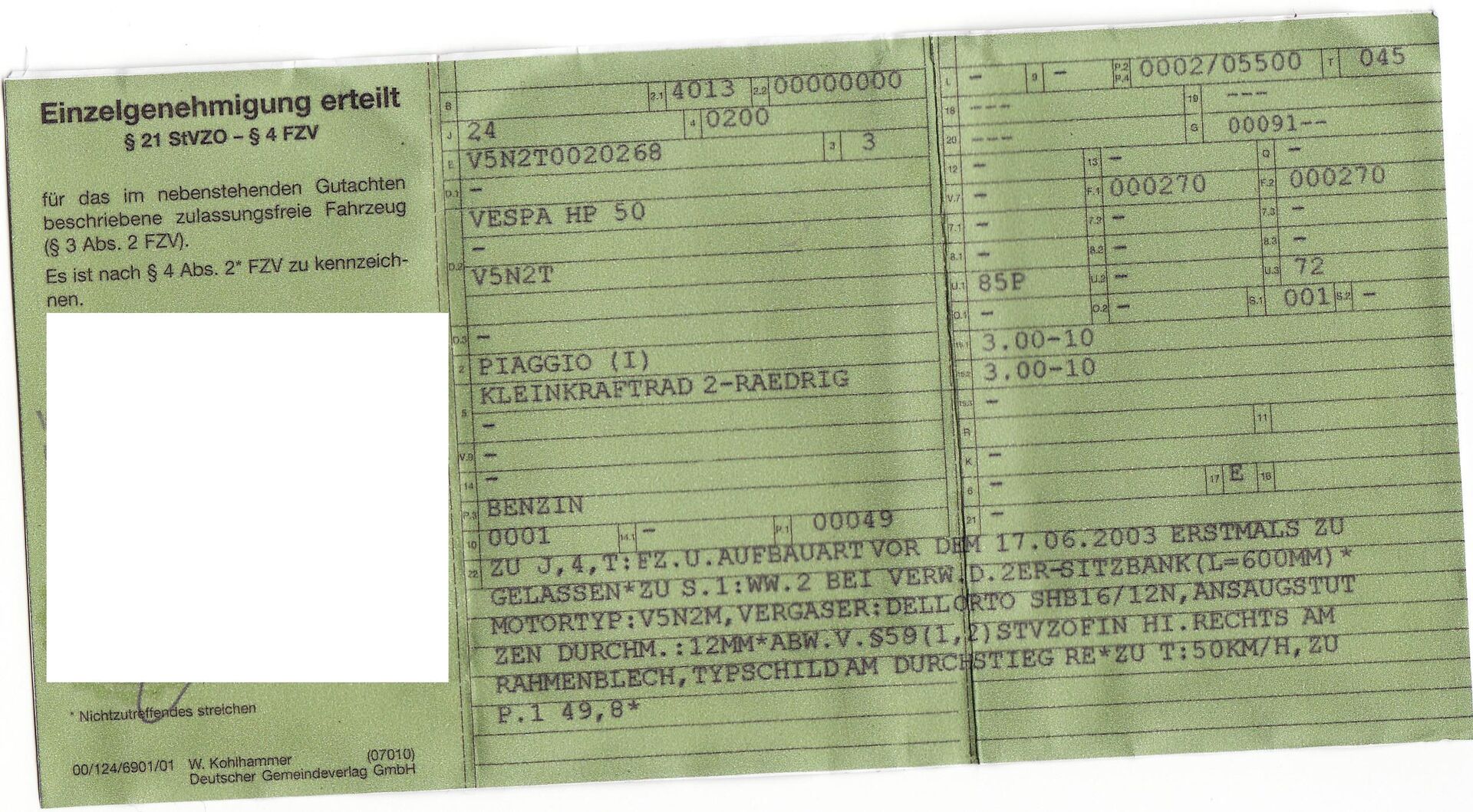 • Hab mir das Teil heute mal anschauen können, allerdings war es total eingebaut in einem Kammerl gestanden, so dass ich mim Handy nur blind Fotos von Fahrgestellnummer und Aufkleber machen konnte und auf dem Aufkleber steht Vespa 50 HP4. Hat einer ne Ahnung wie das mit der Einzelgenehmigung ist, da steht dann als Vmax 45kmh drin oder wie, das wäre ja mal richtig Kacke, sollte scho 50kmh wie bei meiner Xl1 drinnenstehen.