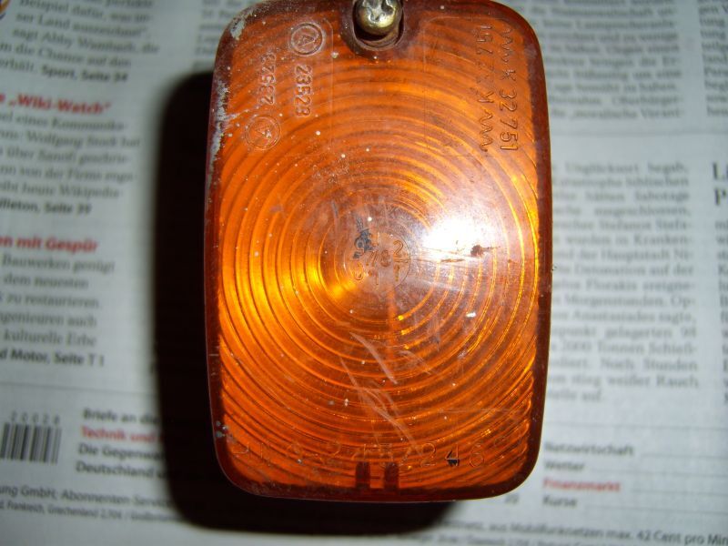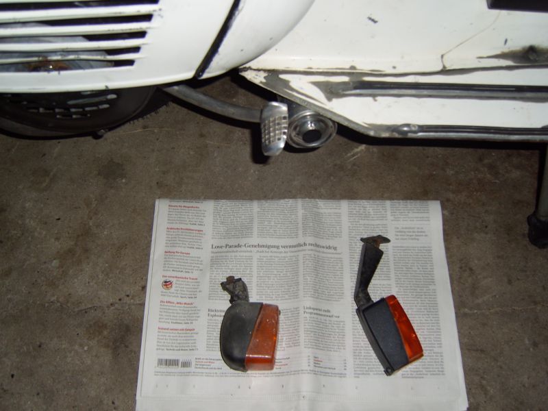 • In Deutschland gabs m. W. nur die eckigen ULO-Blinker an der Special. Deshalb würde ich runde Blinker an so einem Modell für selbstgemachte Umbauten mit Universalblinkern aus dem Motorradbereich halten. Die US-Versionen der Rally, PV, V100 usw. hatten aber teilweise serienmäßig runde Blinker mit Chromgehäuse, ähnlich wie die frühen Bajaj Chetaks für den deutschen Markt.