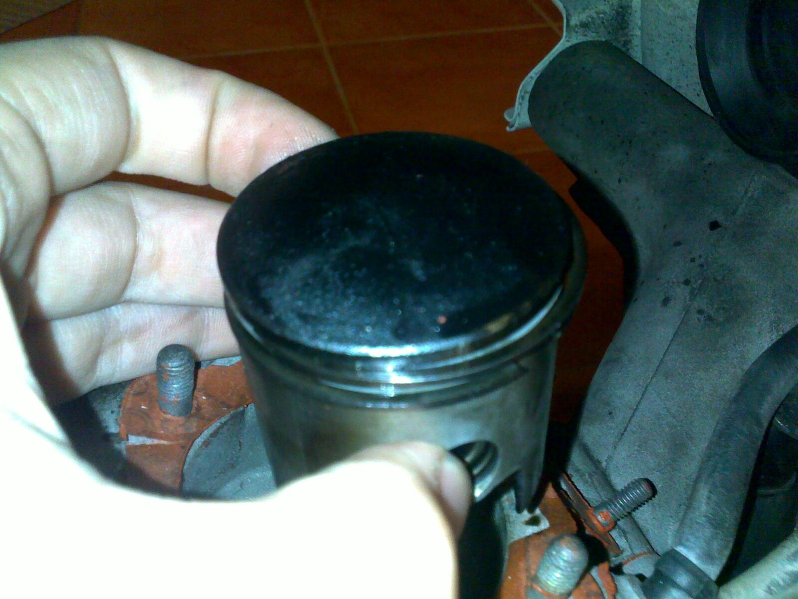 Da ich ja einen leichten Kolbenklemmer hatte, wollte ich auch mal Kolben und Laufbahn anschauen. Dann kam mir ein Polini Kopf entgegen. Zylinder noch abgenommen, dachte dann..hmm bissle groß für 50ccm. Und siehe da: ist ein 75er Polini. Jetzt brauche ich dringend einen Dichtsatz. In dem Motor existieren keine Dichtungen, alles wurde nur mit so brüchiger Dichtpaste abgedichtet, Zylinderfuß, Einlaß, Auslass etc. grauenhaft.