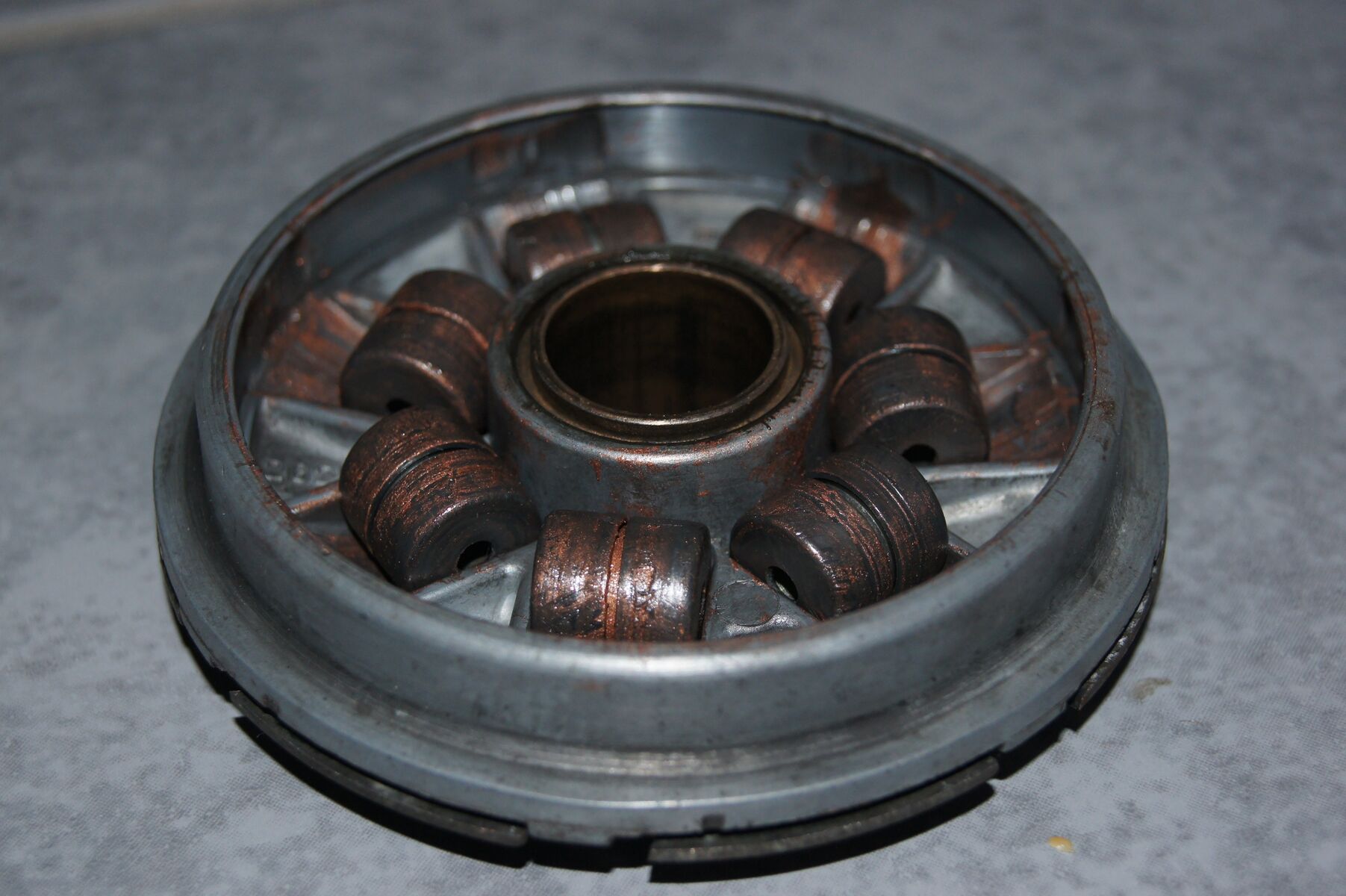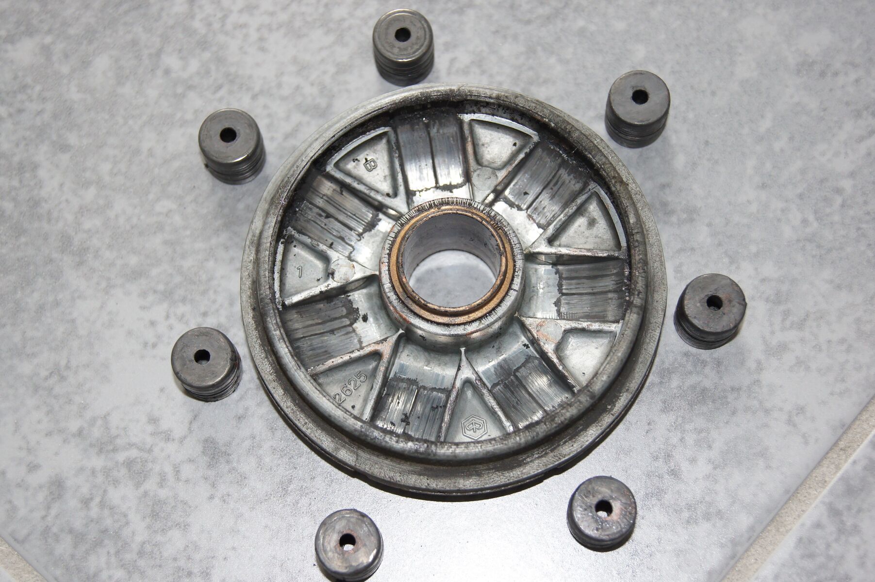Deckel der Variomatik, 7 Fliehkraftrollen und eine Feder (ca. 3 cm lang).