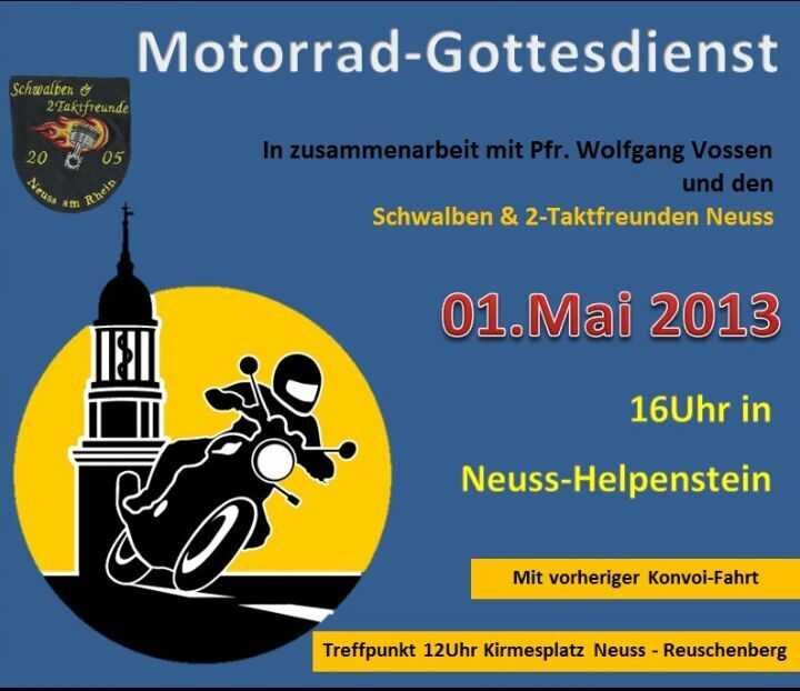 Der Vorsitzende des Swalben- Club Neuss trat an unseren Herrn Pastor heran zwecks Termin für eine Fahrzeugsegnung der 2-takter. Es bot sich der Termin am 01. Mai an, da an diesem Tag um 15:00 immer zu Fuß eine Marienwallfahrt des Seelsorgebereiches Neusser Süden zur Marienkapelle nach Helpenstein statt findet (ca. 30 Leute). Gedacht ist, dass man sich zusammen gegen 16:00 an dieser Kapelle trifft, zusammen (Wallfahrer und Rollerfahrer) die Abschlußandacht hält und hierbei im Anschluß die Fahrzeugsegnung mit durchführt. Abschließend sind alle Beteiligten noch eingeladen gegen eine kleine Spende zu einem Umtrunk und Stärkung in einem Hof gegenüber zu verweilen. Toilettenwagen ist auch vorhanden. Ist Jahr für Jahr immer eine gelungene und schöne Sache.