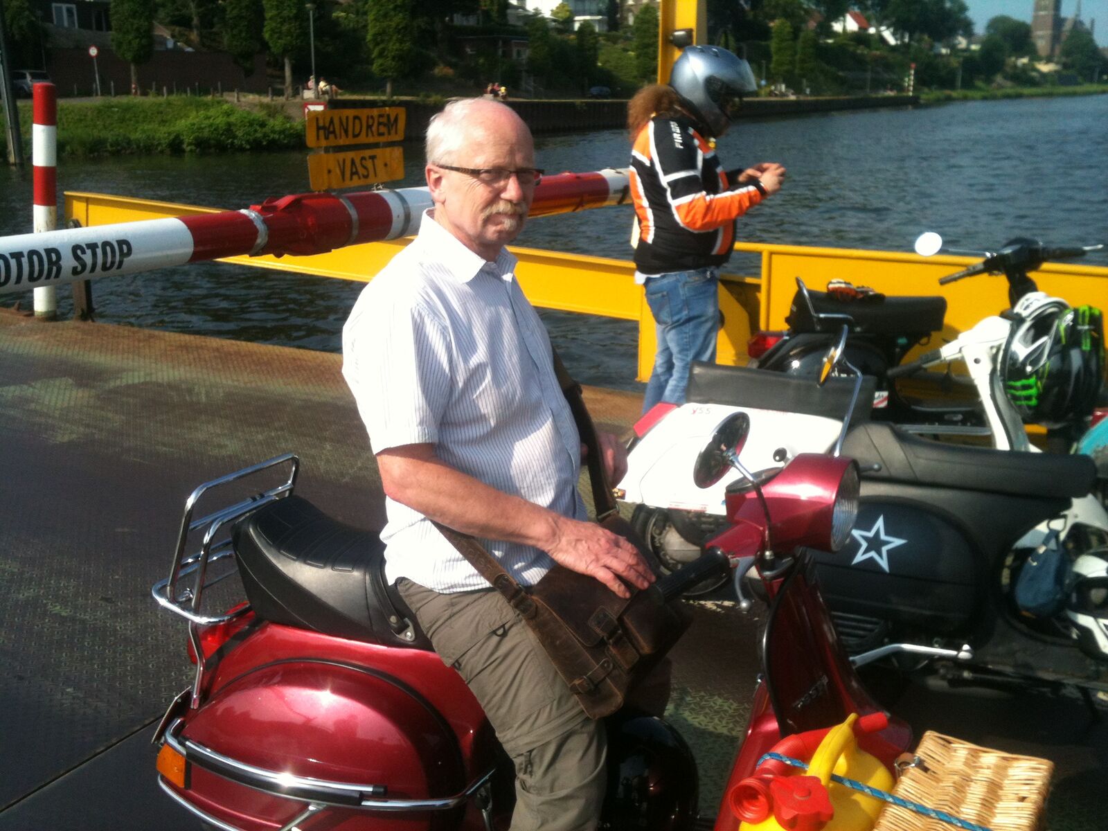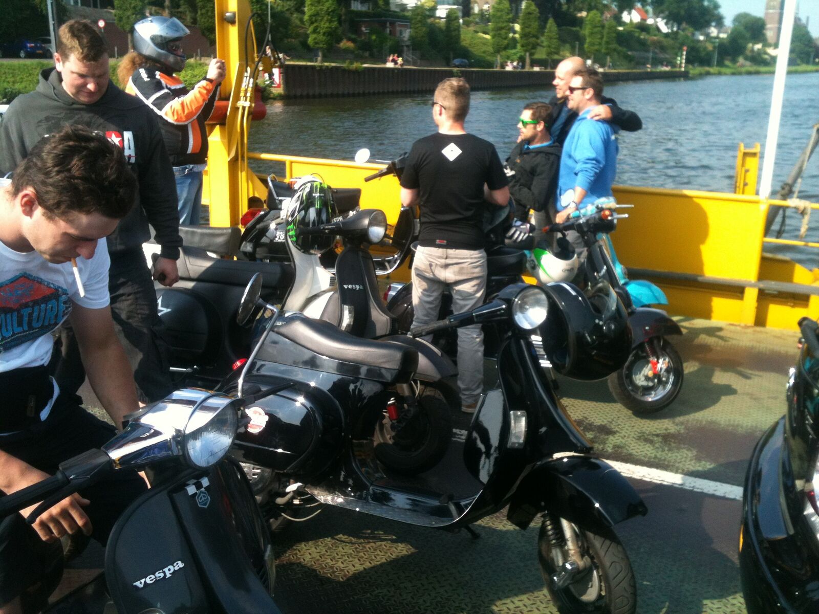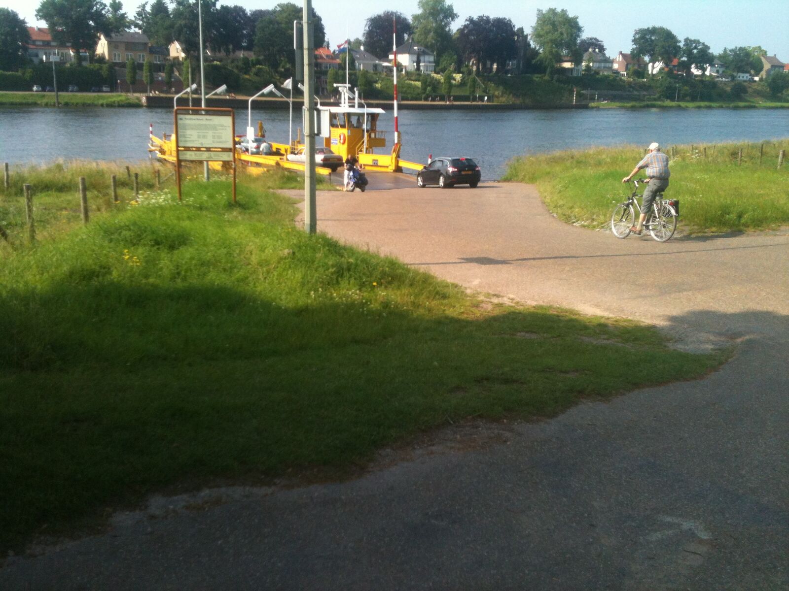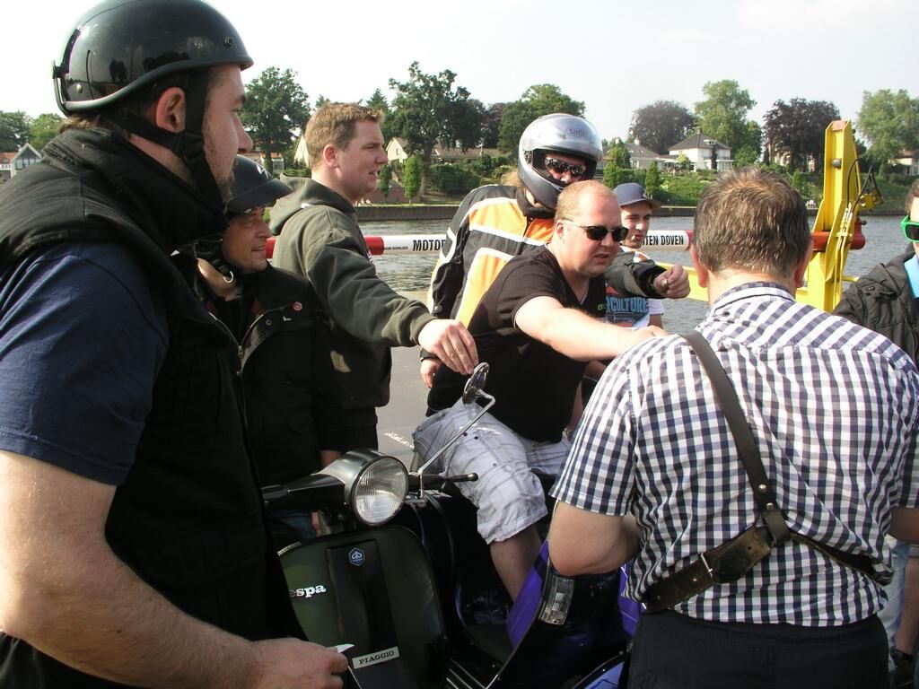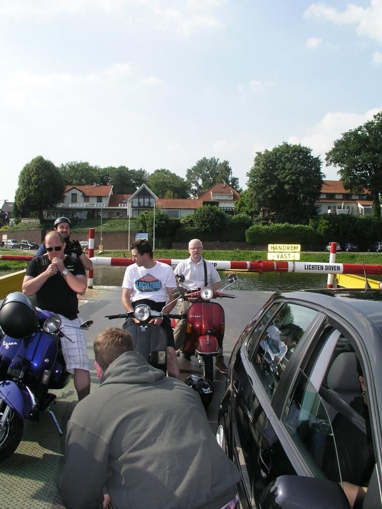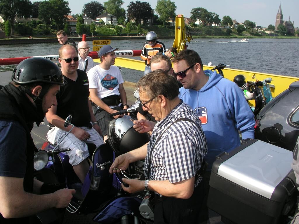 Die Rücktour beginnt, mit einem Polizeiauto im Nacken, über die Brücke, links, entlang der Maas durch Blereck und dann wieder abseits der Hauptstraßen durch landschaftlich noch viel unberührte Natur bis zum kleinen historischen Ort Veer, wo wir dann auch sofort auf die genauso alte Fähre auffahren konnten, die uns sicher ans andere Ufer brachte. Hier dann erstmal nen Päuschen hingelegt und 4 Jungs mussten uns dann leider schon, aus terminlichen Gründen, verlassen.