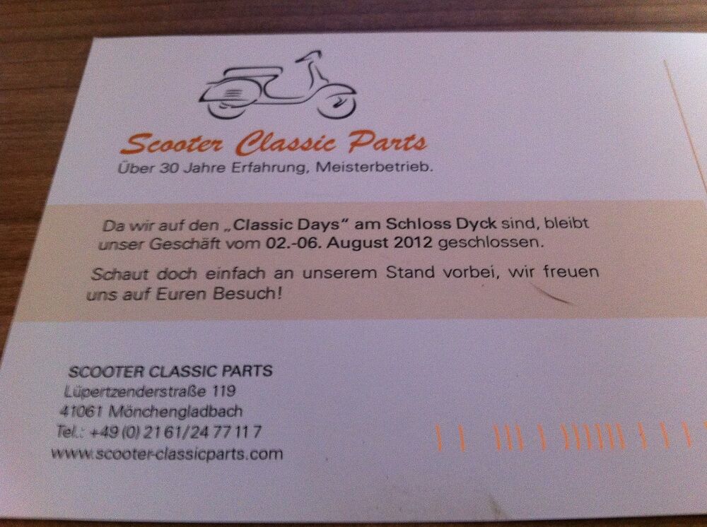 Wer ist denn am wochenende unterwegs? Oder um genauer zu sagen am schloss dyck? Der nette her von Scooter Classic Parts hat dort einen stand aufgebaut, den ich mir aufjedenfall mal anschauen werde.