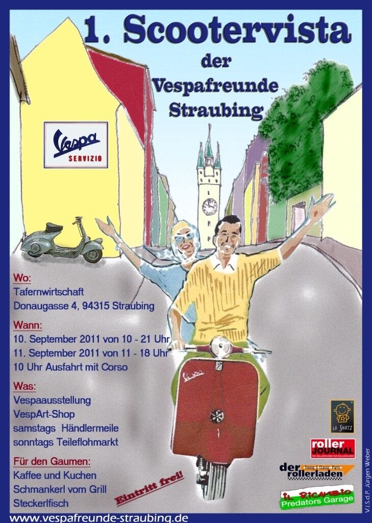 Die Vespafreunde Straubing geben sich die Ehre und laden alle Freunde des italienischen Kultrollers, egal ob groß oder klein – mit oder ohne Roller, zur 1. Scootervista im Herzen der Gäubodenstadt Straubing ein. Direkt an der Donaubrücke in der Tafernwirtschaft werden die Vespafreunde Straubing am 10. und 11. September 2011 eine kleine Auswahl erlesener Roller- und Teilehändler, T-Shirt-Designer und eine Rollerzeitschrift ihre Waren und Dienste feilbieten. Die kreativen Köpfe der Vespafreunde bieten zusätzlich eigene exklusive Kreationen aus Glas-, Metall-, Papier-, Holz- und Textilprodukten an, die im VespArt-Shop zu finden sind.