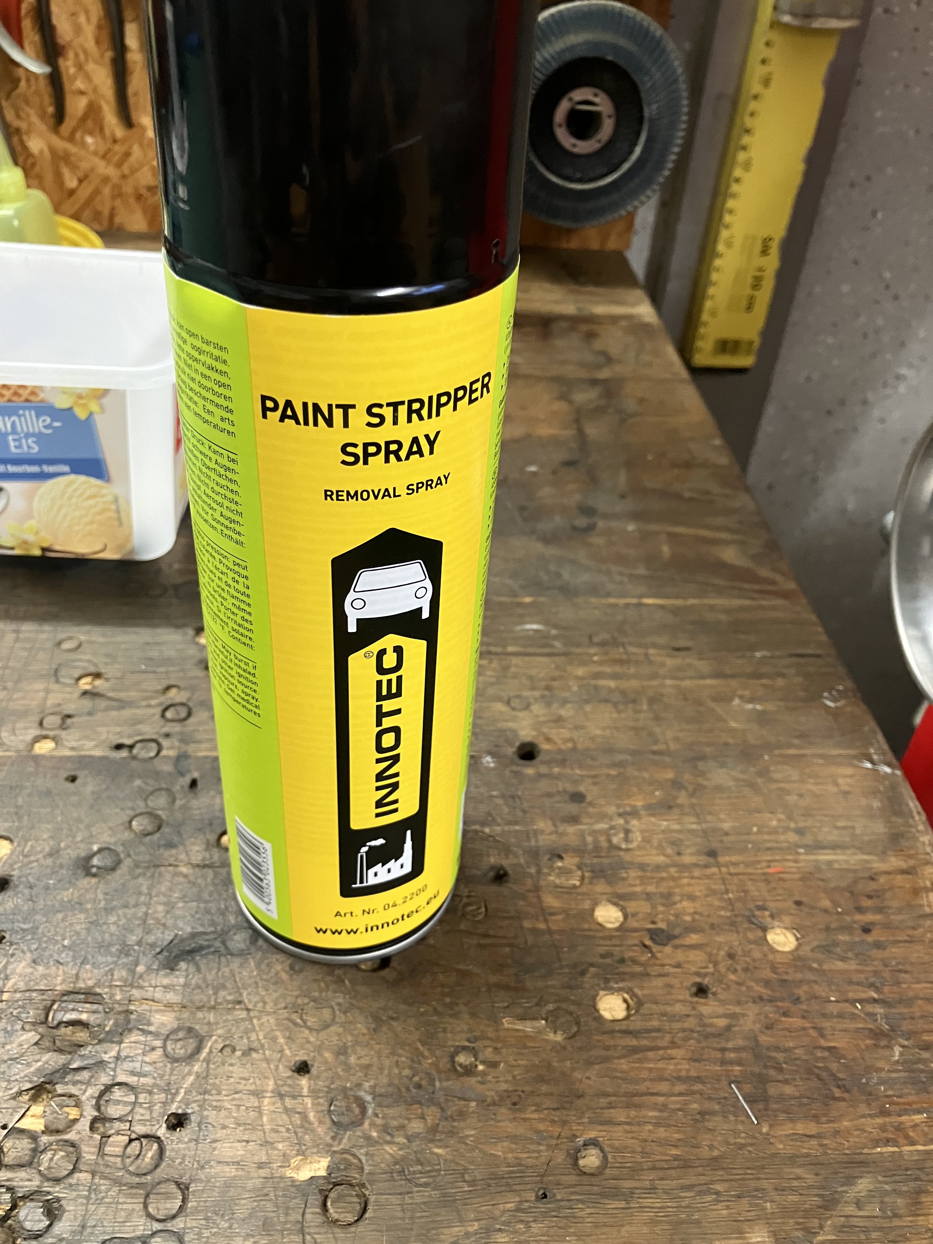 Ich würde mal Essigessenz etwas verdünnen und Salz bis zur Sättigung darin auflösen und mal an einem Stück Blech ausprobieren, auf das Lack aufgetragen wurde und mechanisch wieder Scharten bekommen hat.