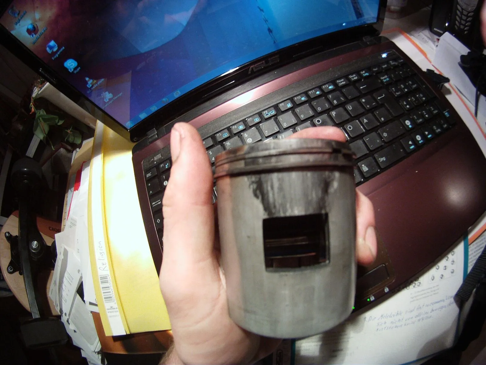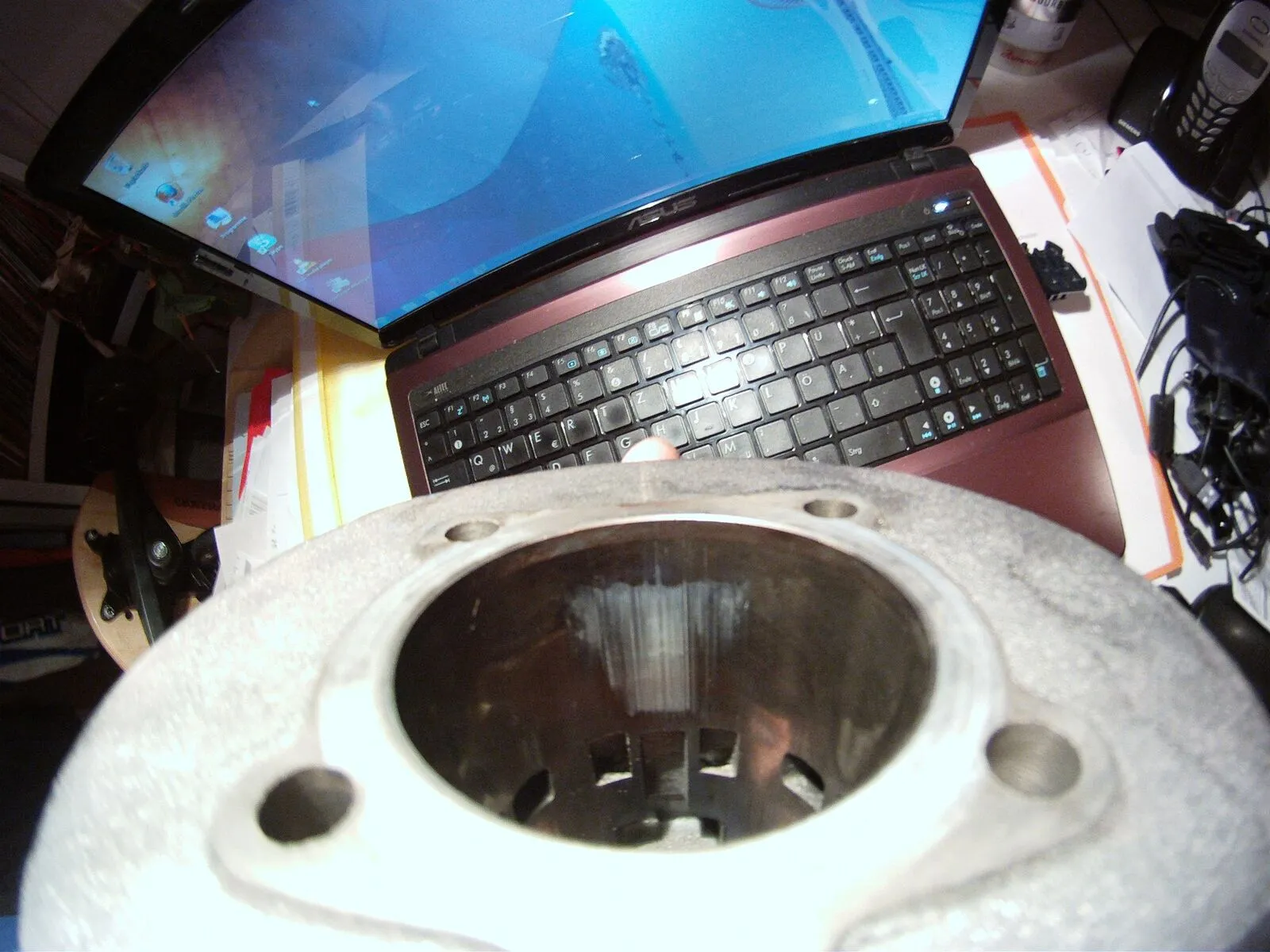 So bin eig. am Ende meine Einfahrphase gewesen als ich auf der Schnellstraße bei ca.80 kmh und 75% Gas gegeben hab, hat er angefangen zu fressen. Schnell Kupplung gedürckt und daheim mal probiert, war nicht fest aber anmachen wollte ich ihn nicht! Vergaser ist viel zu fett eingestellt und fahre zum einfahren Mischung 1 zu 15! Daheim Zündkerze raus gemacht, war schön schwarz! Zylinder runter gemacht und gesehn das er oben am Einlass und Auslass gefressen hat. Alles genau angeschaut und eine Macke am Kolben oben gefunden, sieht aus als ob ein Metalspann drinne war.
