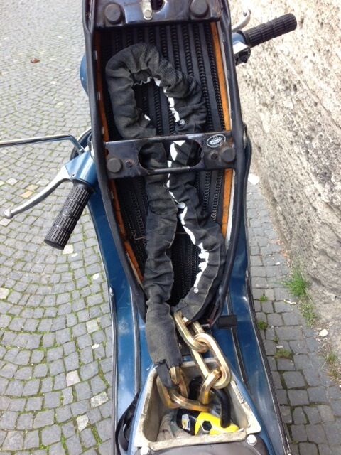 Wo um alles in der Welt wollt ihr auf der V50 (ohne Gepäckfach und Gepäckttäger) ein 140cm langes und 10 Kilo schweres Schloß transportieren ohne die Vespa zu beschädigen?