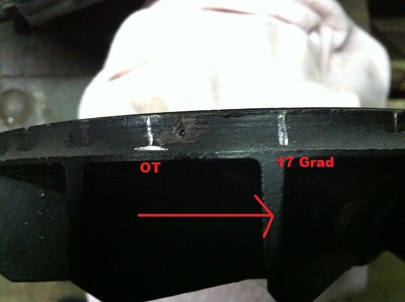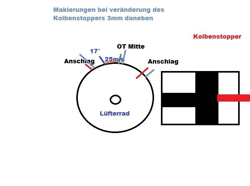 Lüftergeäuse für Makierung ist 534mm / 360 *17 =25,2mm die habe ich von OT gegen den Uhrzeiger angebracht. OT mit einen Kolbestopper gemessen und noch mal geprüft passt.