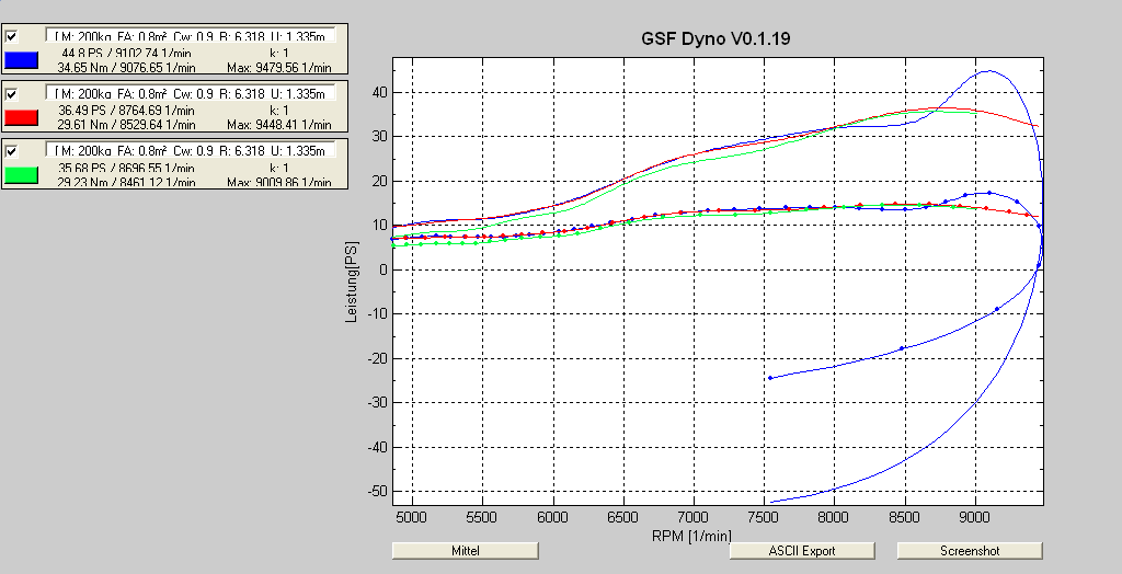 die absolute Leistungsaussage ist mit dem GSF-Dyno immer schwierig. Ich habe an Cw-Wert 0,5 und Stirnfläche 0,75 qm nichts geändert. Oft ist der Cw-Wert etwas zu niedrig, die Stirnfläche passt aber meist recht gut.