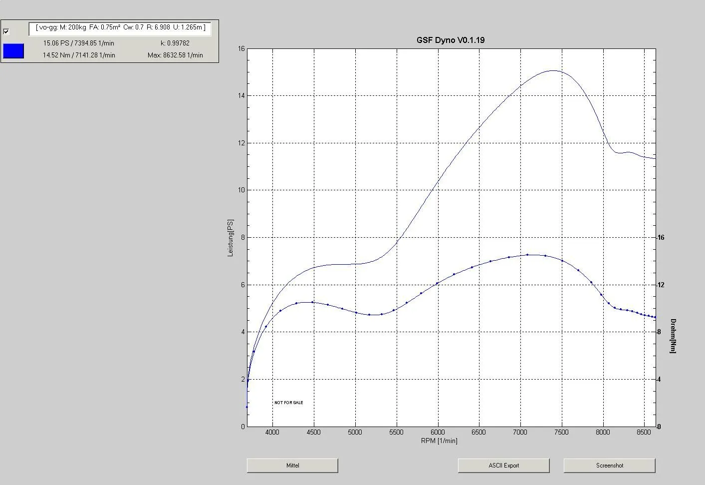 Die von nachbrenner gezeigte Kurve ergibt sich im Dyno so oder so ähnlich je nach gewählten Parametern für Luftwiderstand und Stirnfläche. Allerdings sehen die WAV-Files auch etwas seltsam aus. Die Aufnahme macht Sprünge als ob sie geschnitten wäre oder eventuell die Kupplung rutscht ...