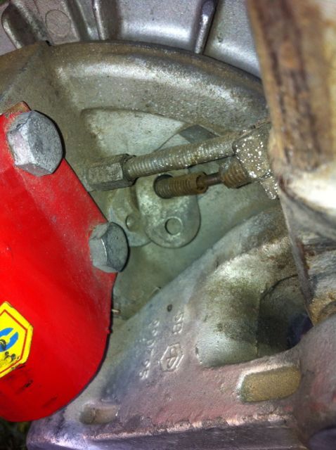 Die fehlende Schraube hält die Klemmplatte für die Tachowelle; die Platte komprimiert eine innenliegende Gummibuchse, die sich daraufhin radial verengt und dadurch die eingeschobene Tachowelle fixiert. Der Bereich sieht schon ein wenig angegriffen aus, ich würde hier mal alles auseinandernehmen, das Tachoritzel auf Verschleiß prüfen und frisch fetten.