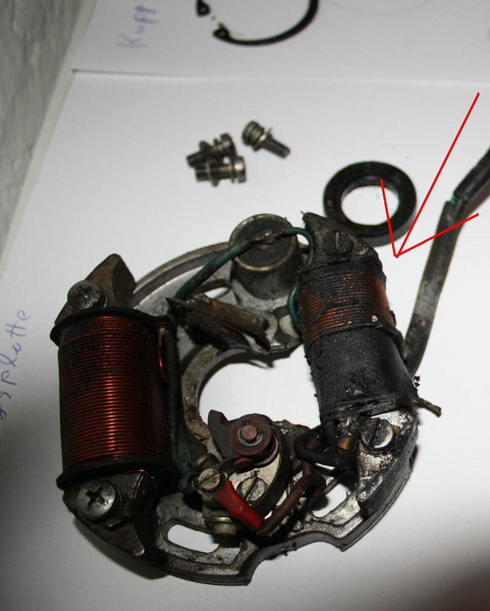Warum die Spule? Licht glimmt beim Kicker treten (Schnarre geht auch). Kondensator bereits gewechselt. Wenn ich das grüne Kabel anstatt dem roten auf die außenliegende Zündspule lege, habe ich beim kicken einen Funken ergo Zündspule, Kabel und Zündkerzenstecker sind ok. Bleibt nur noch die Spule. Lieg ich da richtig? Wenn ja, was kann an einer Spule kaputt gehen?