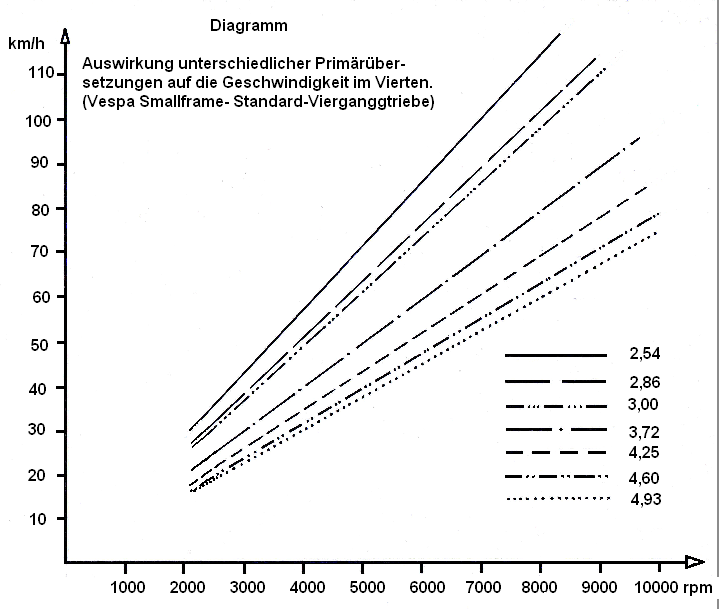 Damit läuft die Kiste schön. Zieht sauber bis zum Tachoanschlag; es würde sogar noch nen bisschen mehr gehen. Der 3. dreht laut Tacho auf 70 km/h -> ~ 7200 upm. (s. Tabelle im Anhang liegt zw. den Geraden 3,72 & 4,25)