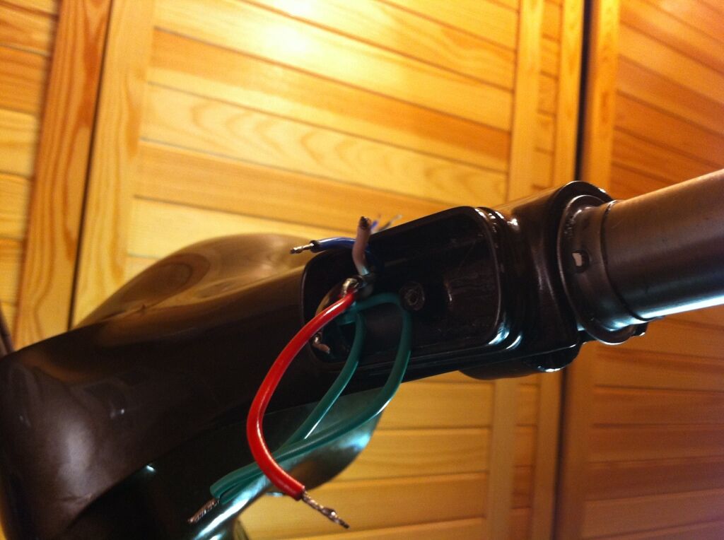 1. Ist es richtig, dass ich den Kabelbaum wie auf den beiden Bilder (hoffentlich gut) zu sehen, direkt durch die Öffnung am Lenkkopf führe und dann zum Schalter oder muss ich ihn auch durch das Gasrohr führen? Und wenn die zweite Alternative stimmt, durch welche Öffnung im Lenkrohr muss er denn wieder raus? Durch die hintere (zum Lenkkopf hin) oder durch die vordere (Richtung Bremshebel)?