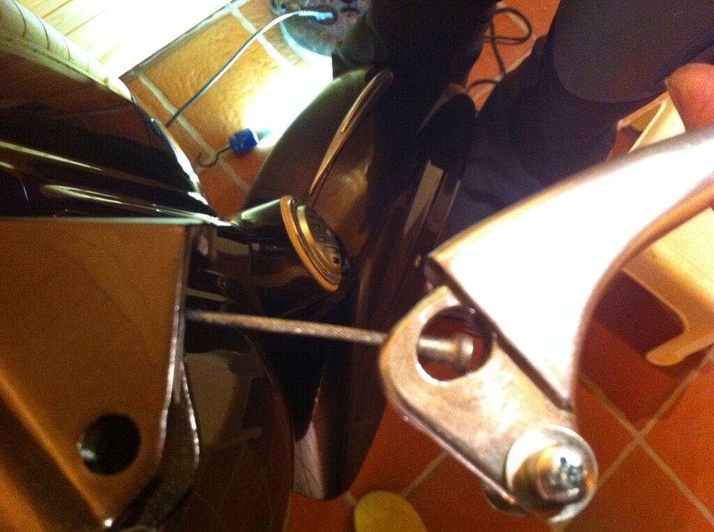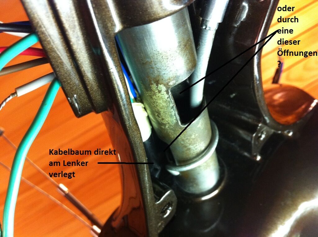 1. Ist es richtig, dass ich den Kabelbaum wie auf den beiden Bilder (hoffentlich gut) zu sehen, direkt durch die Öffnung am Lenkkopf führe und dann zum Schalter oder muss ich ihn auch durch das Gasrohr führen? Und wenn die zweite Alternative stimmt, durch welche Öffnung im Lenkrohr muss er denn wieder raus? Durch die hintere (zum Lenkkopf hin) oder durch die vordere (Richtung Bremshebel)?