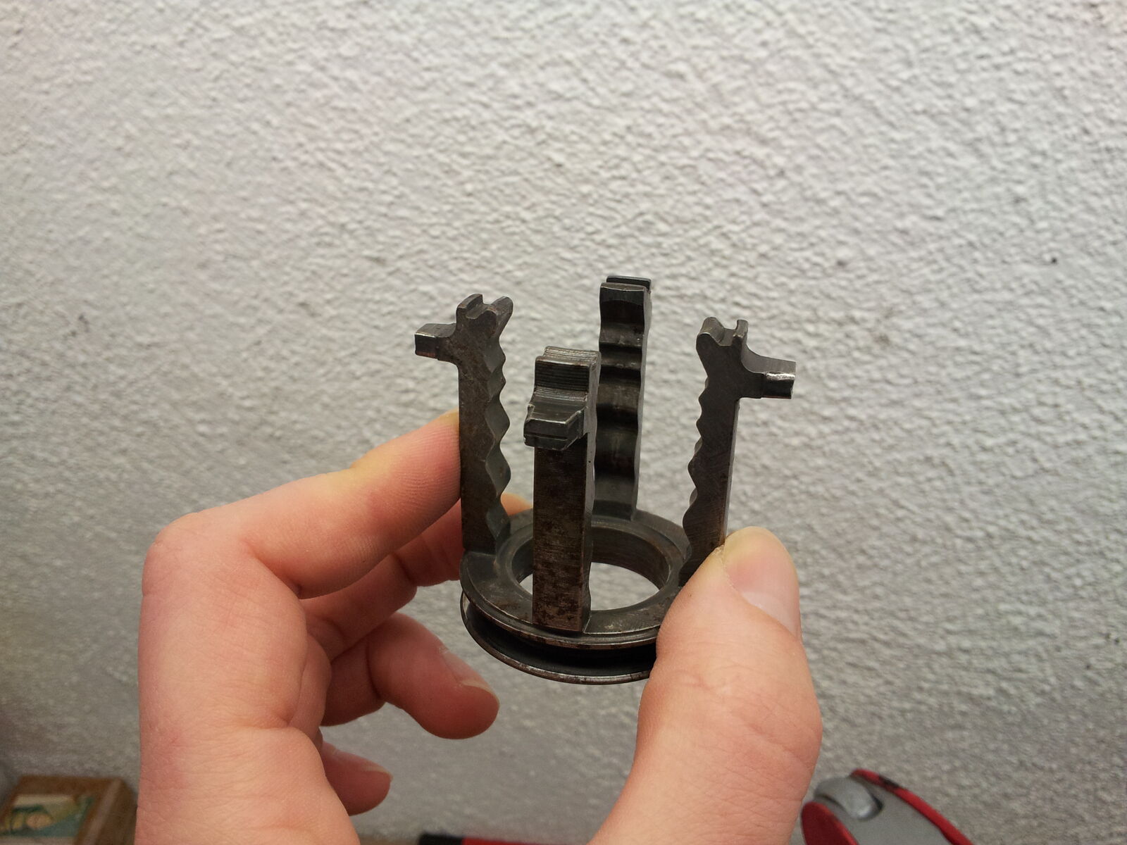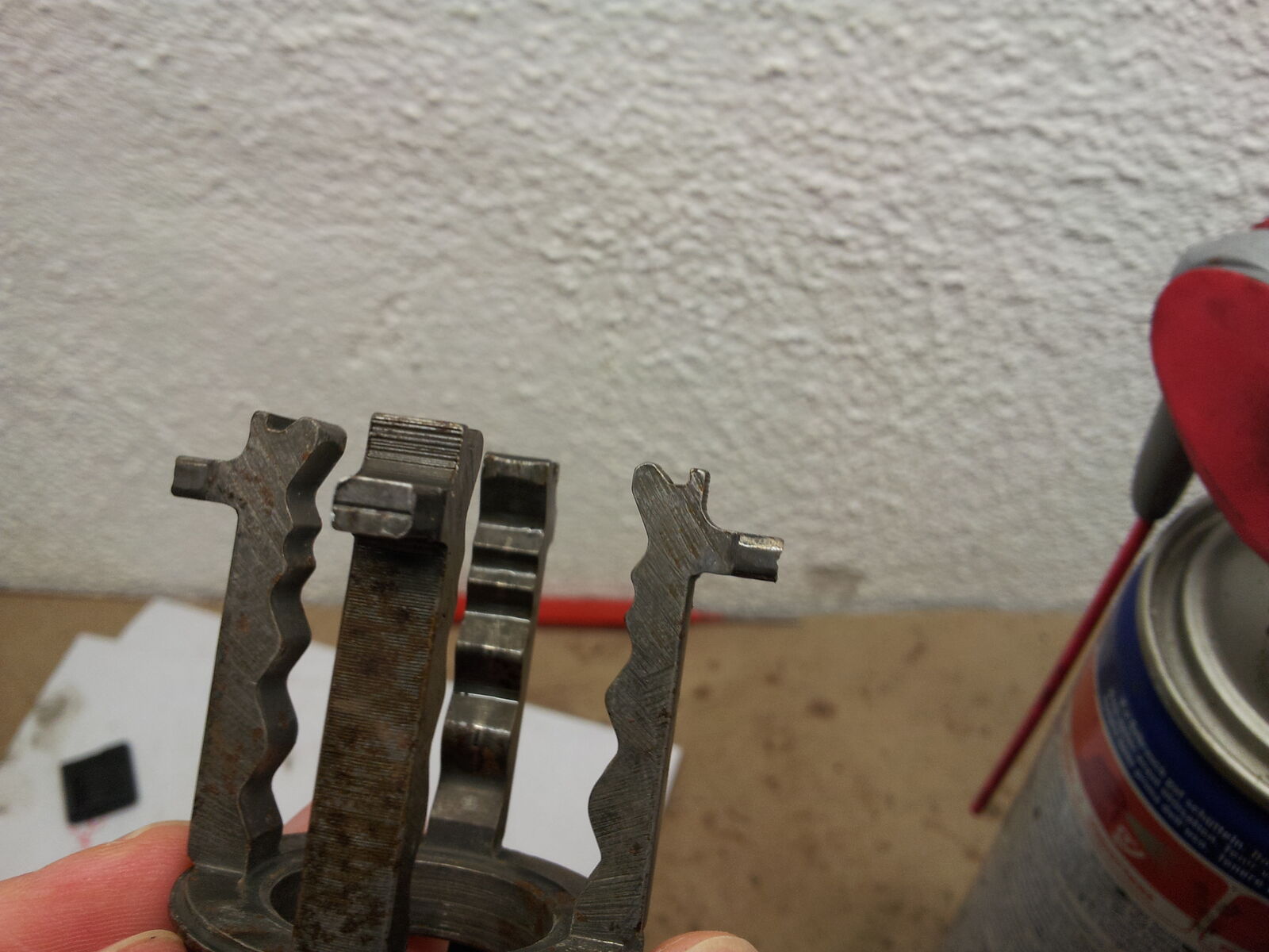 lass die scheiß klaue um himmels willen drin bei der fuffi und distanzier das getriebe einfach ordentlich knapp. also 0,2mm oder etwas weniger. dann springt auch nix, egal wie verdaddelt die klaue ist.