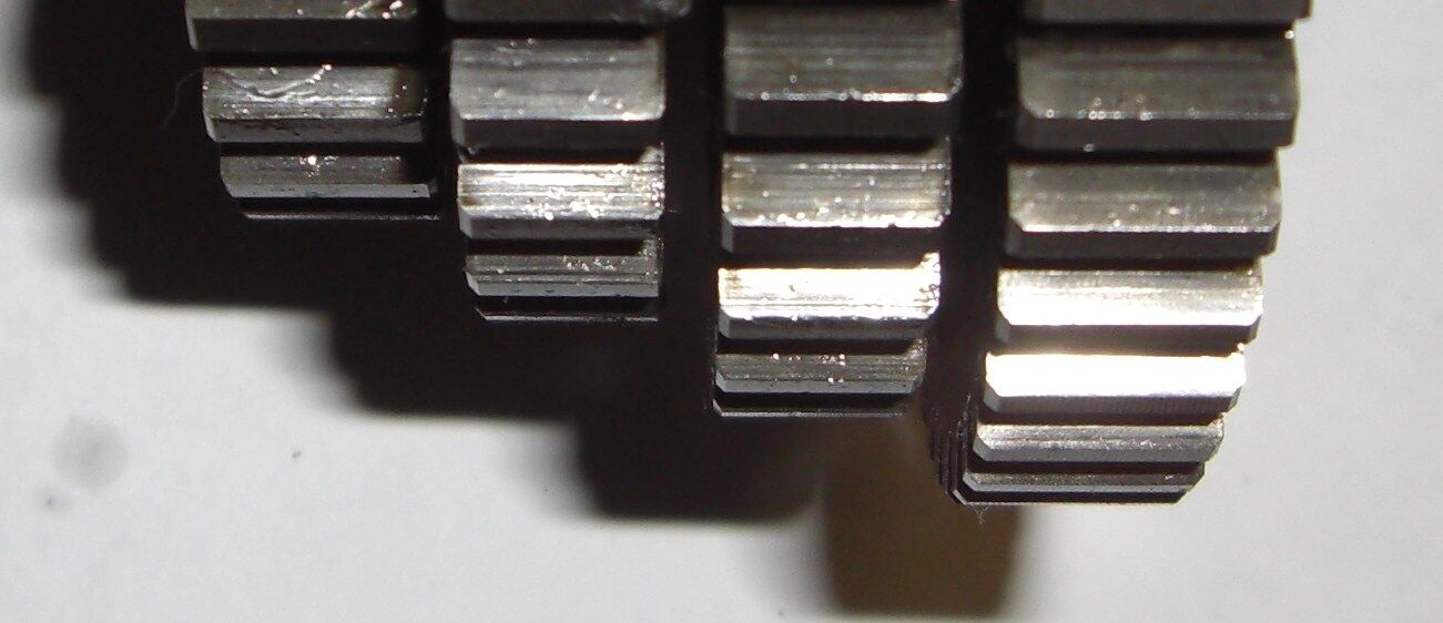 Die Zahnräder sehen soweit ganz gut aus, bei der Nebenwelle/Vorgelege/Tannenbaum bin ich mir nicht so sicher, was die (linken) Flanken angeht (Das was da so stufenmäßig abgebrochen aussieht) :