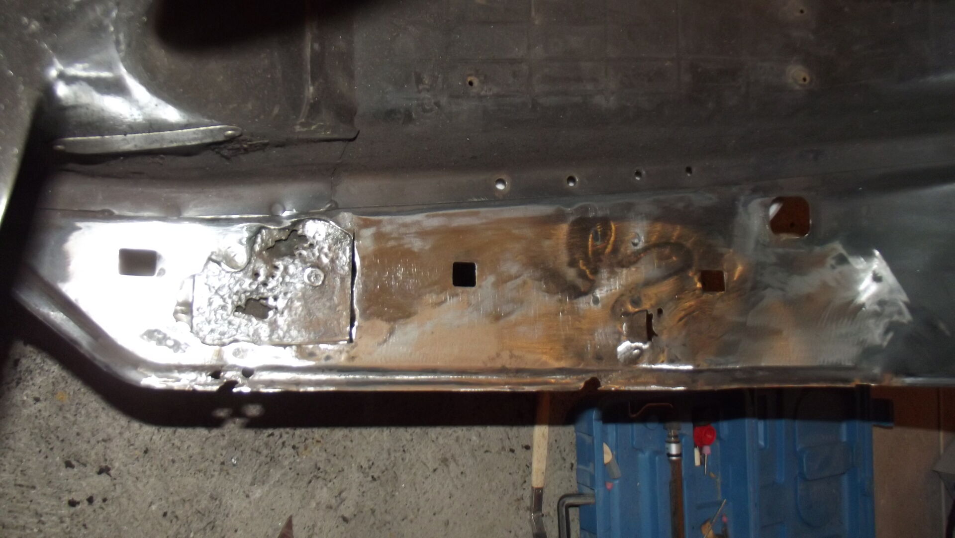 am Heck war mal ne wunderhübsche plastikabdeckung die auf den müll flog. die löcher die darunter waren zum befestigen der abdeckung wurden zugeschweisst und verzinnt. ebenfalls der falz im fussraum und am heck.