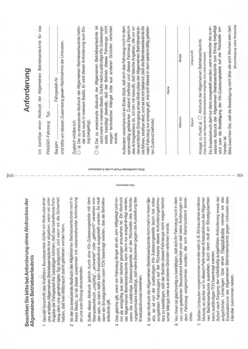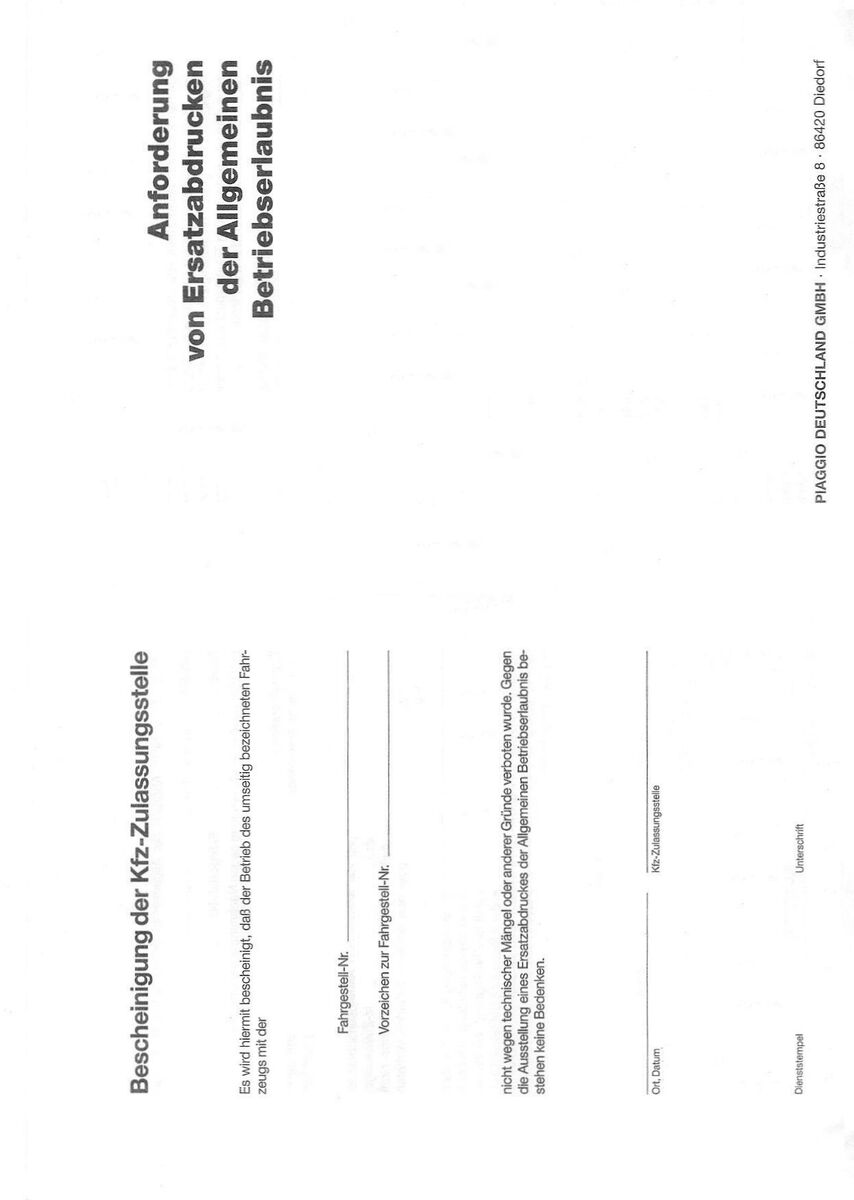 Nein ist es nicht. Fülle diesen Antrag aus, und lass den von der Zulassungsstelle abstempeln. Dann gehst Du damit zum Vespahändler, der leitet den dan weiter und Du bekommst neue Papiere. Achtung in dem Antrag ist eine Falle, die Nummer " V5X3T 02104711" besteht aus Type (V5X3T) und Rahmennummer (02104711). Richtig eintragen.
