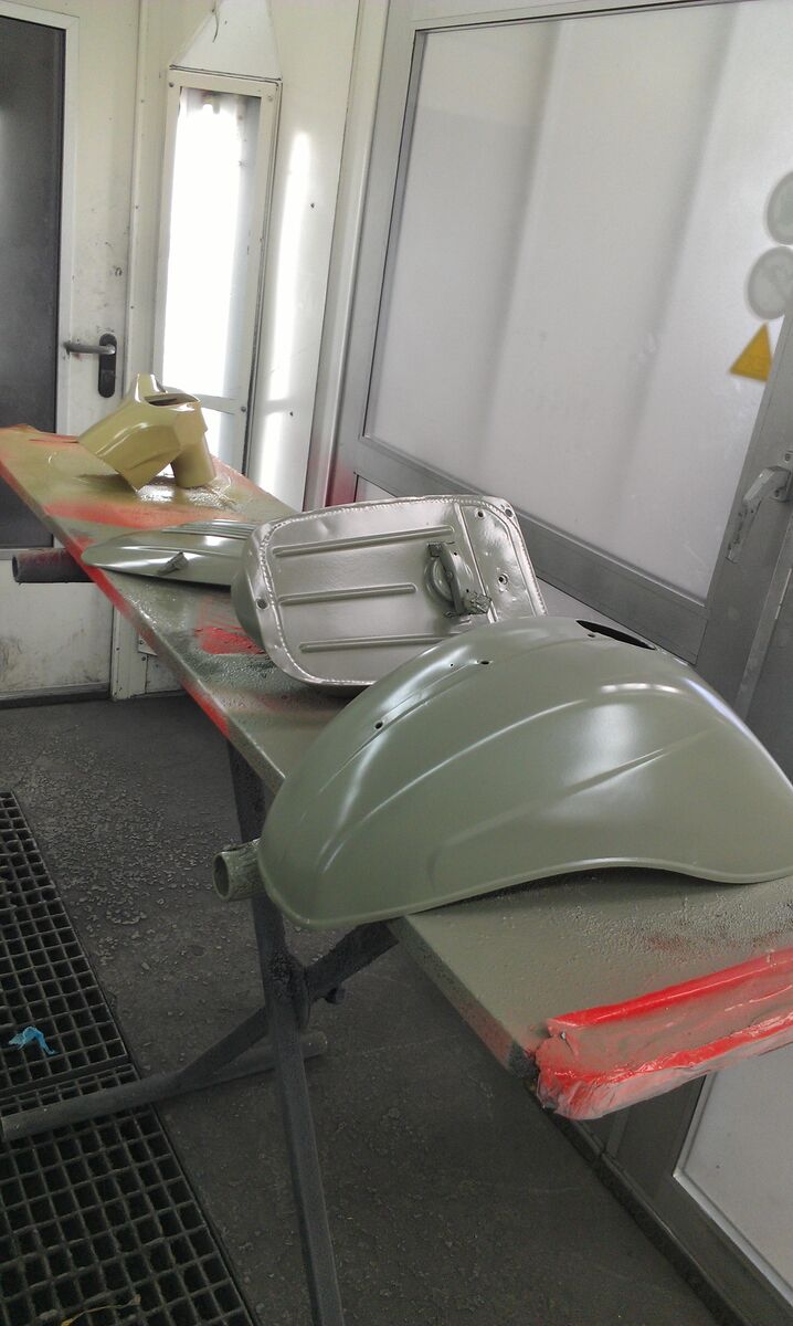 Jetzt ist alles gestrahlt fürs erste, Tank, Koti und Seitendeckel mit EP Füller gespritzt und Lenker mit Wash-primer. So weit fürs erste, weiter hehre die Tage.