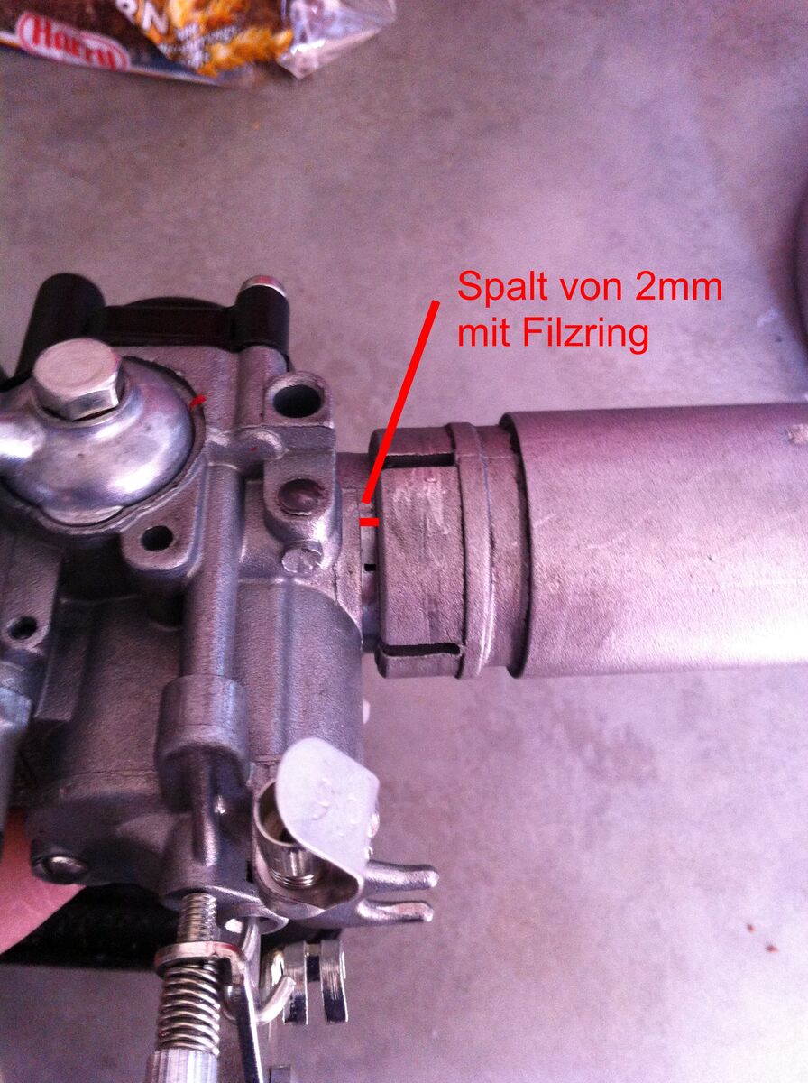 Beim Einbau der neuen Kappe und des neuen Vergasers (alter ASS, 2-Loch, langer Stehbolzen) stellt sich nun raus, dass mit Einsetzen des Filzrings (gut gefettet) der Vergaser nicht ganz in die Kappe hineingeht. Nachmessen ergab, dass die Länge der Nasen des Vergasers der Länge des abgedrehten Bundes vom ASS entspricht. Es sind ganze 0,2mm „Luft“ dazwischen, der Filzring lässt sich jedoch auf maximal 1mm quetschen.