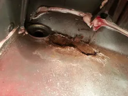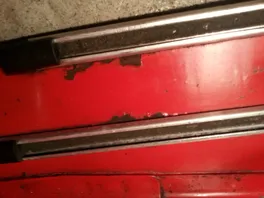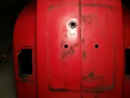 Die Roststellen an der Karosse hab ich mal fotografiert. Neben dem Stoßdämpfer der typische Rost (muss wohl schweißen). Mir ist aufgefallen, damals hat wohl jemand das Ding schon mal schlecht überlackiert, mit einem Rot was sich etwas abhebt vom O-Lack ![]()