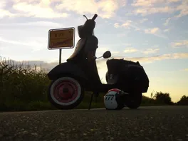 Schönes Bild - Mir gefällt, wie man die Farbe der vorderen Felge und den Helm erkennen kann, sowie man erahnen kann, um welchen Vespatyp es sich handelt