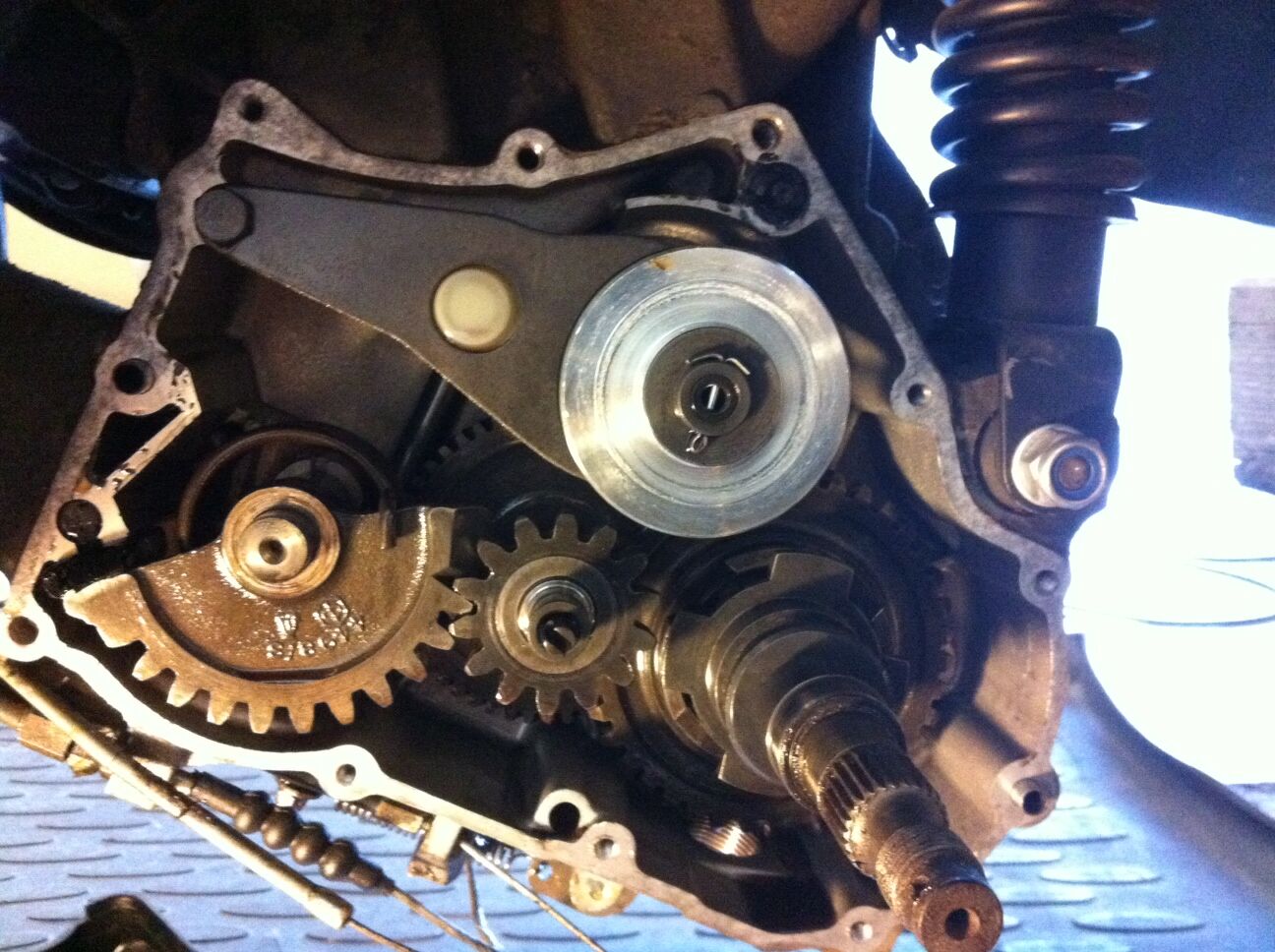 Dann zur Fliehkraftkupplung, die sitzt oben hinter der Riemenscheibe, siehe Bilder, im Standgas läuft der Riemen unten, wenn Du beschleunigst sollte der Riemen hochlaufen bis zum größten Umfang, wenn das nicht geht sitzen die Rollen fest(hinter der Riemenscheibe)