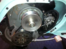 Dann zur Fliehkraftkupplung, die sitzt oben hinter der Riemenscheibe, siehe Bilder, im Standgas läuft der Riemen unten, wenn Du beschleunigst sollte der Riemen hochlaufen bis zum größten Umfang, wenn das nicht geht sitzen die Rollen fest(hinter der Riemenscheibe)