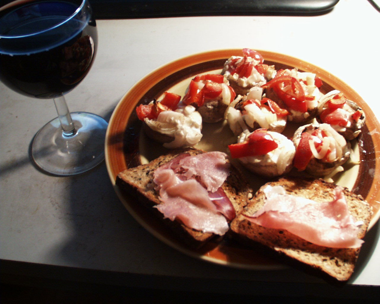 Gefüllte Champignons mit Rohschinken auf Körnerbrot und einem Glas Rotwein