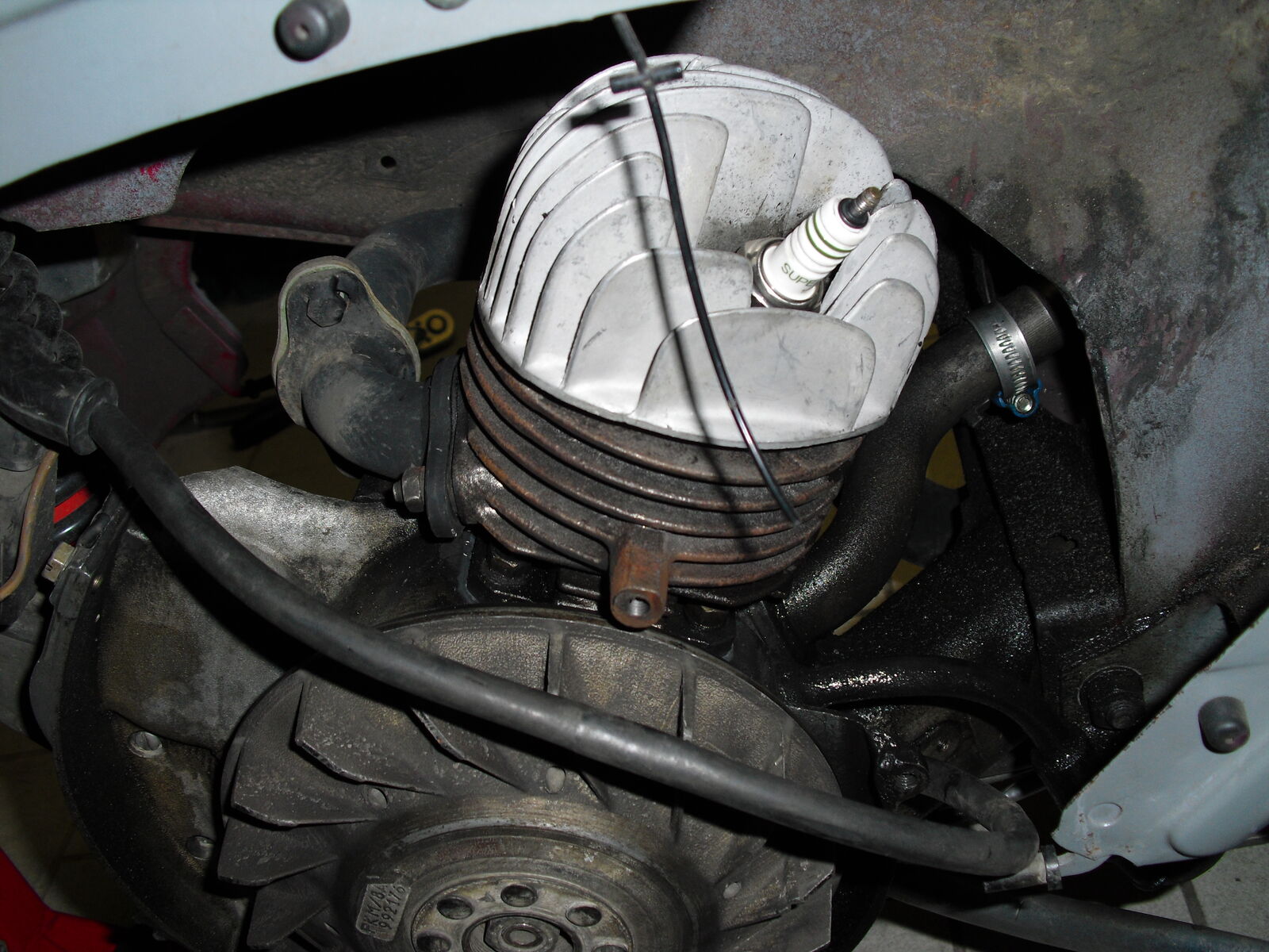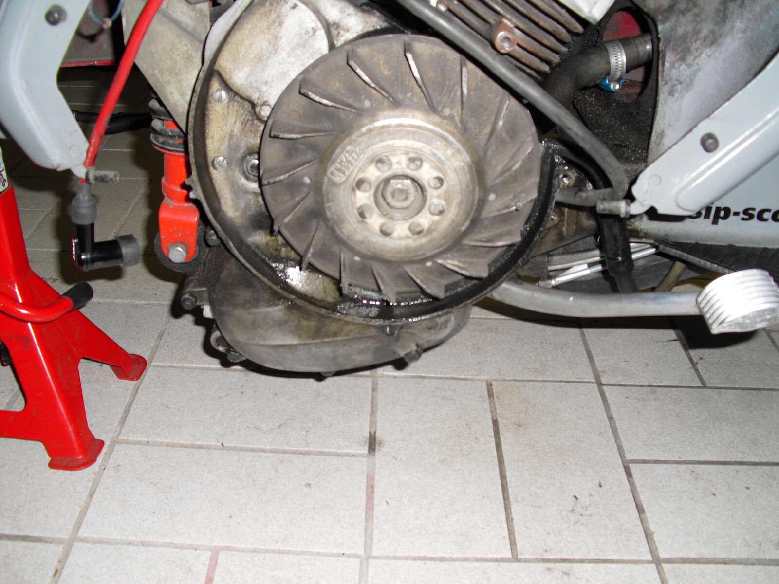 • so hab mal den motor frei gemacht am ASS wär eine schraube recht locker und dichtung könnt eine neue nicht schaden, ebenfalls sieht es aus als wenn es am zylinderfuss bisschen raussifft und was mir aufjedenfall aufgefallen ist jetzt das es hintermlüfterrad sifft...kann man auch auf dem bild gut erkennen.