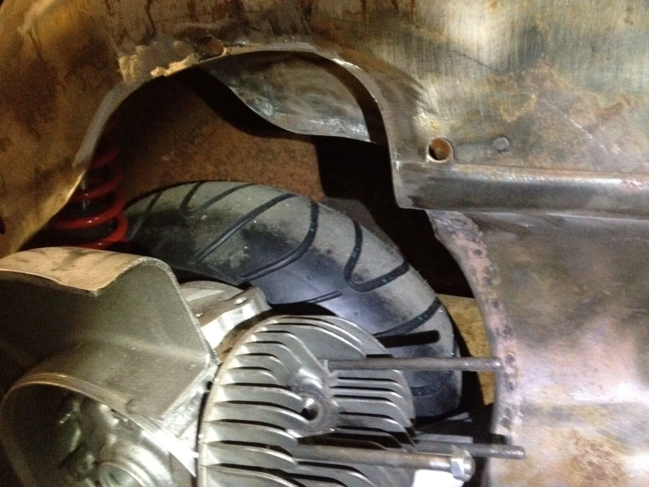 Der Vergaser braucht Platz. Also muss da noch eine Tasche ins Blech.