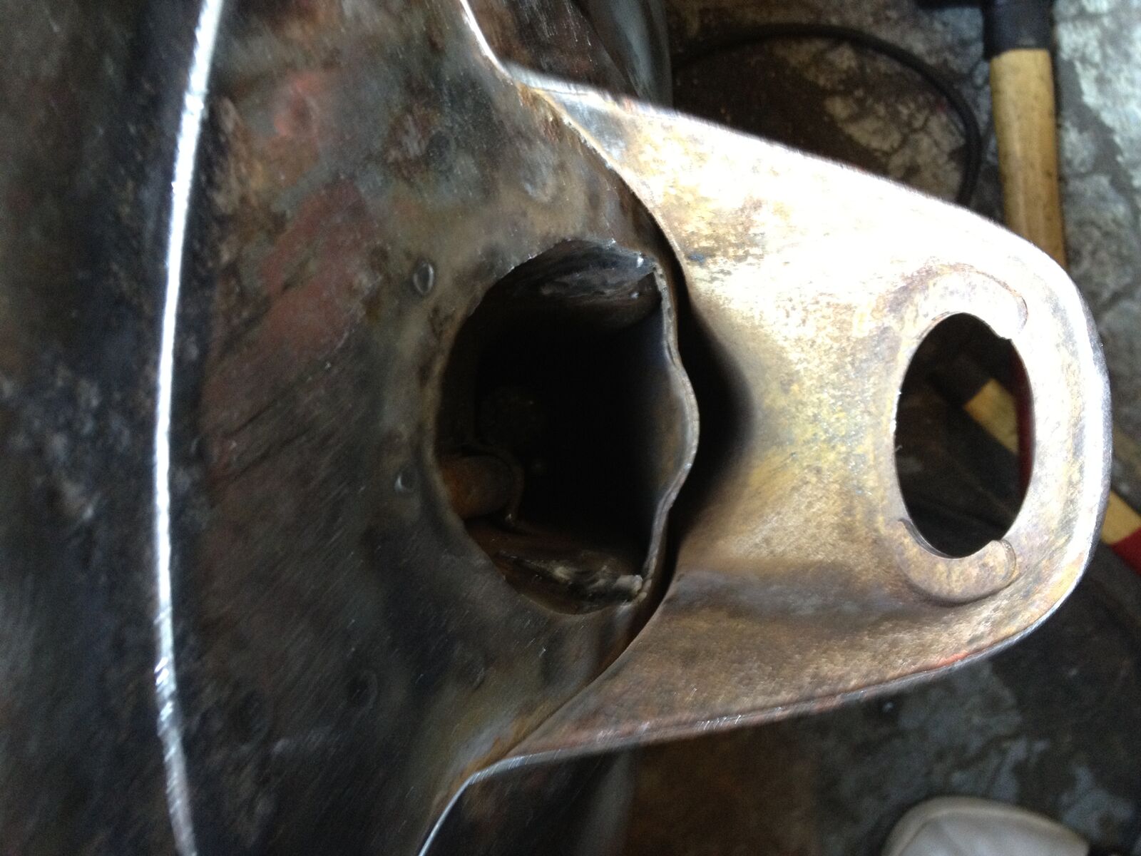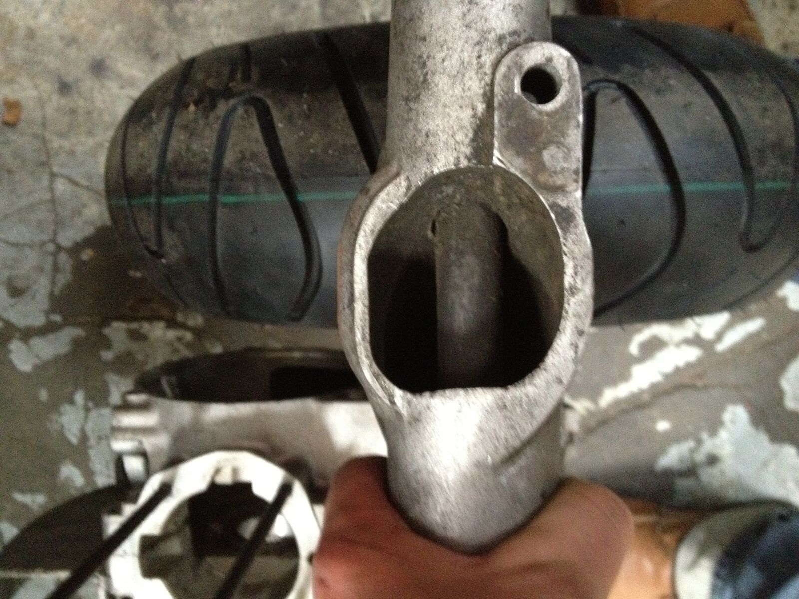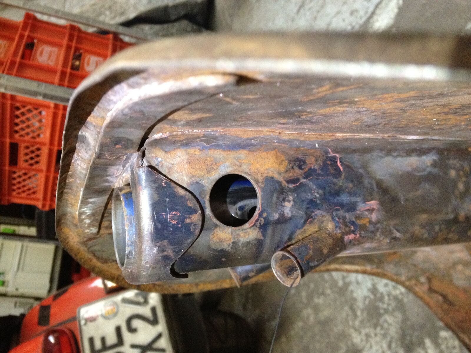 Das Mädchen hat sich doch etwas geziert bis das Rohr drin war. Dafür passt es jetzt recht gut. Es ist bei der Geschichte leider nur 1 Grad mehr Sturz rausgekommen, aber Kleinvieh macht auch Mist. Der originale Lagersitz hat 35mm Durchmesser, das Px Rohr hat 40mm. Ich habe den alten Lagersitz im Blech einfach nach hinten erweitert um mehr Sturz zu bekommen Auf dem zweitenm Bild sieht man vorn sehr gut die Kante vom alten Sitz.