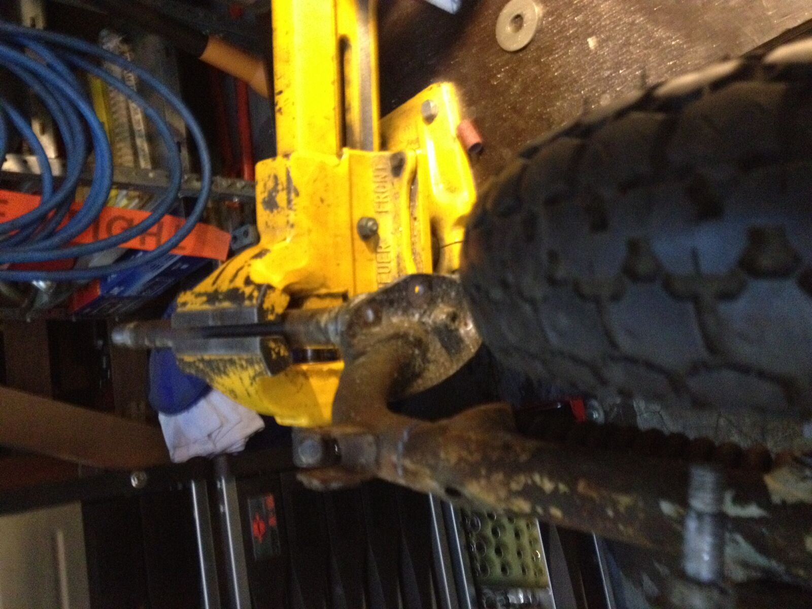 Nach 2 Flaschen Bier (es war mal Becks, anstelle von Astra) und Diskussionsrunde im Werkstattkreis kam einem Kollegen die Idee. Wenn man das Gabelrohr oberhalb des Dämpfers absägt und verdreht kommt man damit an der Achse weiter aus dem Drehpunkt des Lenkrohres. Diskutiert, ausprobiert, passt!