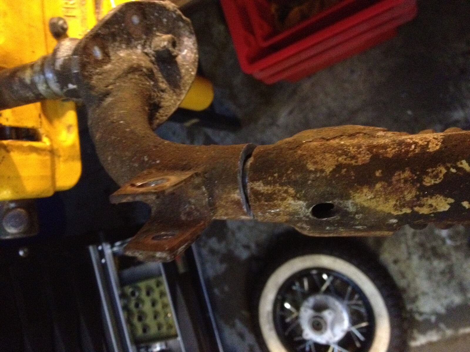Damit man nicht alles abstrahiert, so schlau bin ich dann nun auch nicht, habe ich erstmal die Schwinge abgesägt. Da der Bolzen, um den die Schwinge dreht, bis zu Ankerplatte durchgeht und dort sein zweites Lager hat, muss ich eine neue Schwinge konstruieren und fräsen lassen, die eben das zweite lager an anderer Position hat. Um das Rad einigemaßen in die Richtung zu bekommen musste die Ankerplatte weg. Nach einigem hin und her habe ich schon mal den Abstand ermittelt den der Sattel zu den Speichen haben muss. Damit konnte ich nun auch klar festlegen wo die Bremsscheibe zur Felge sitzen muss. So fand ich dann heraus, dass ich im günstigstem Fall 10mm Spurversatz nach links haben würde.Nicht gut!