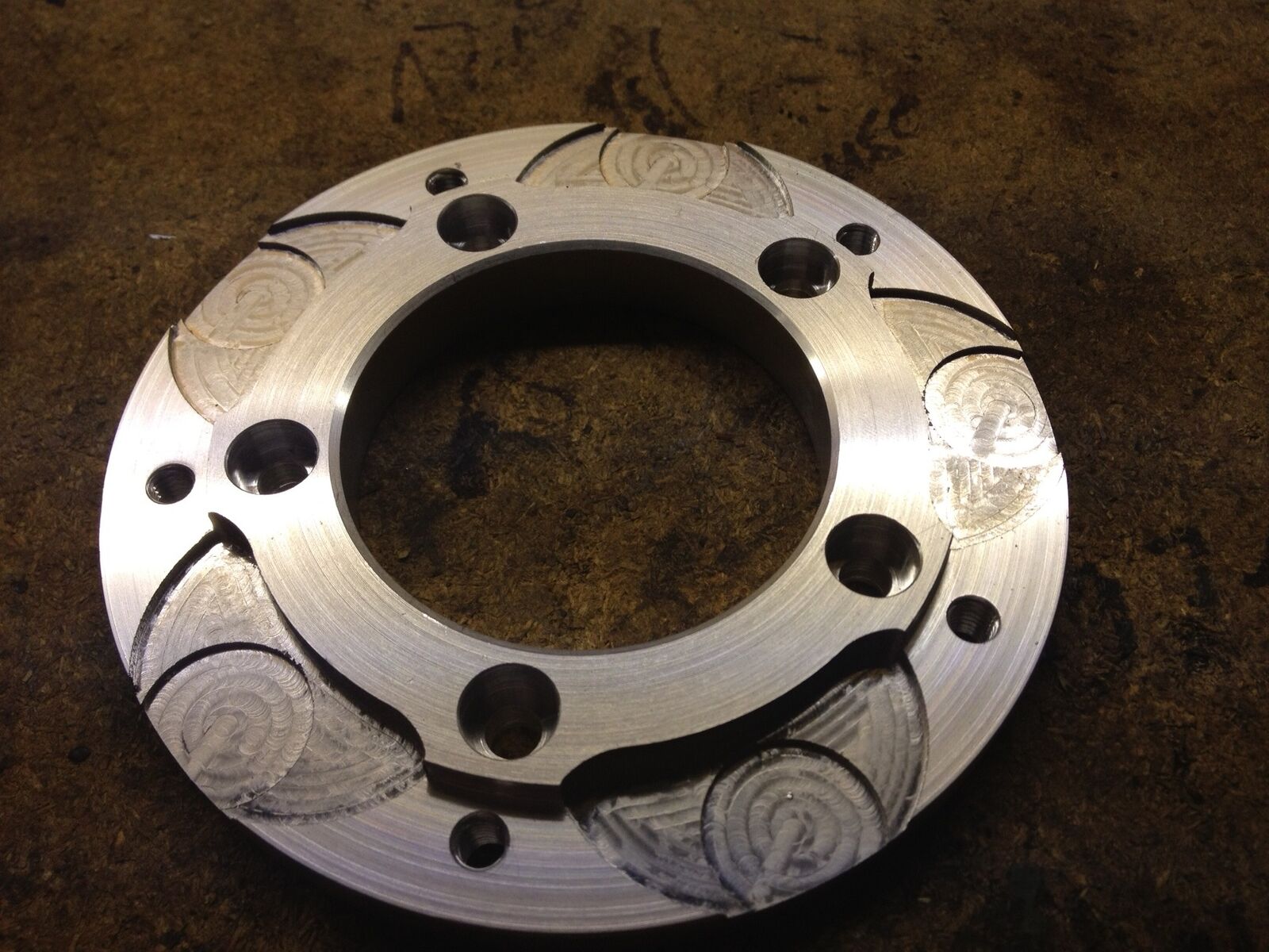 Ich habe die Scheibenadapterplatte aus zwei Gründen einzeln gedreht und schraubbar ausgelegt. Der eine Grund ist, dass sich sonst in die eine Wange die Löcher für die Speichen nicht bohren lassen. Der andere ist, dass ich wenn es mit der Scheibe nicht ganz zum Sattel passt, immer noch tricksen kann.