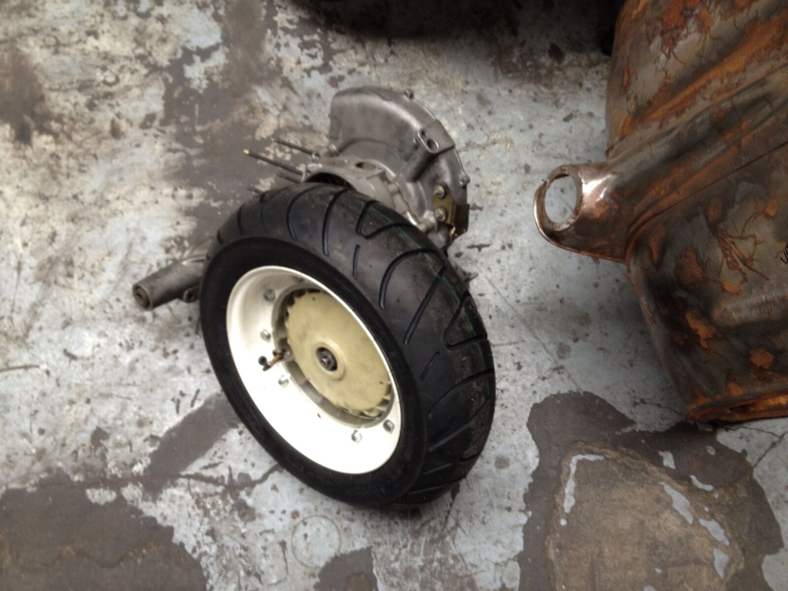 • Ich habe in der Zwischenzeit die ersten Sachen zusammen getragen: Bitubo hinten, flammneues 200er Getriebe, DRT Tannenbaum, Vespatronic, Lagersatz, und neue Steuerlager. Über Ebay UK kam noch dieser schöne Scheinwerfer, dazu und aus Pathologie meiner Werkstatt habe ich noch ein PX Lenkrohr rausgeschnitten.