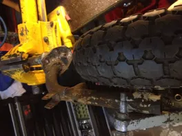Damit man nicht alles abstrahiert, so schlau bin ich dann nun auch nicht, habe ich erstmal die Schwinge abgesägt. Da der Bolzen, um den die Schwinge dreht, bis zu Ankerplatte durchgeht und dort sein zweites Lager hat, muss ich eine neue Schwinge konstruieren und fräsen lassen, die eben das zweite lager an anderer Position hat. Um das Rad einigemaßen in die Richtung zu bekommen musste die Ankerplatte weg. Nach einigem hin und her habe ich schon mal den Abstand ermittelt den der Sattel zu den Speichen haben muss. Damit konnte ich nun auch klar festlegen wo die Bremsscheibe zur Felge sitzen muss. So fand ich dann heraus, dass ich im günstigstem Fall 10mm Spurversatz nach links haben würde.Nicht gut!