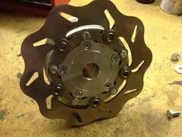 Ich habe die Scheibenadapterplatte aus zwei Gründen einzeln gedreht und schraubbar ausgelegt. Der eine Grund ist, dass sich sonst in die eine Wange die Löcher für die Speichen nicht bohren lassen. Der andere ist, dass ich wenn es mit der Scheibe nicht ganz zum Sattel passt, immer noch tricksen kann.
