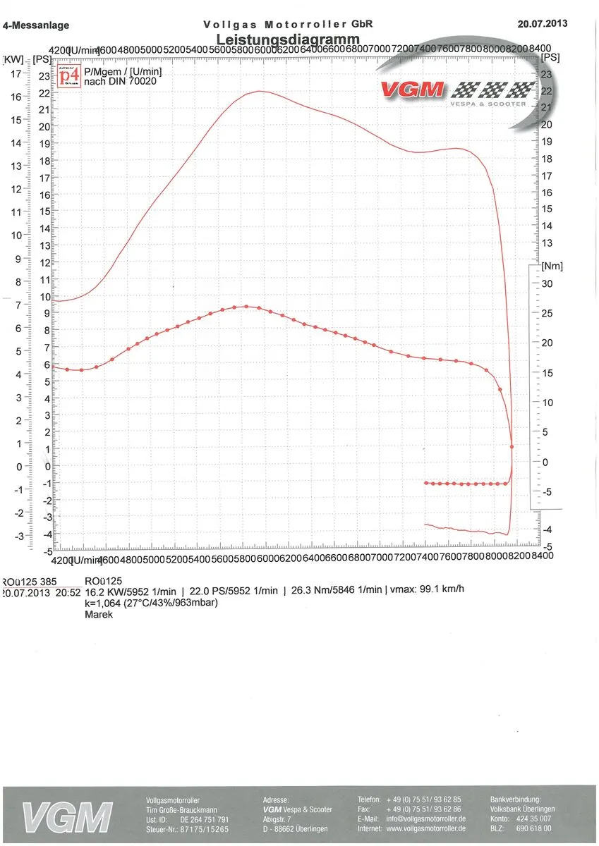 QuattriniMit einen andeen Auspuff ginge da mehr, der Newline S nimmt ca ca 3 PS in der Spitze, dafür ist er leiser. Wäre der Motor sauberer abgedüst fände sich bestimmt noch ein PS.