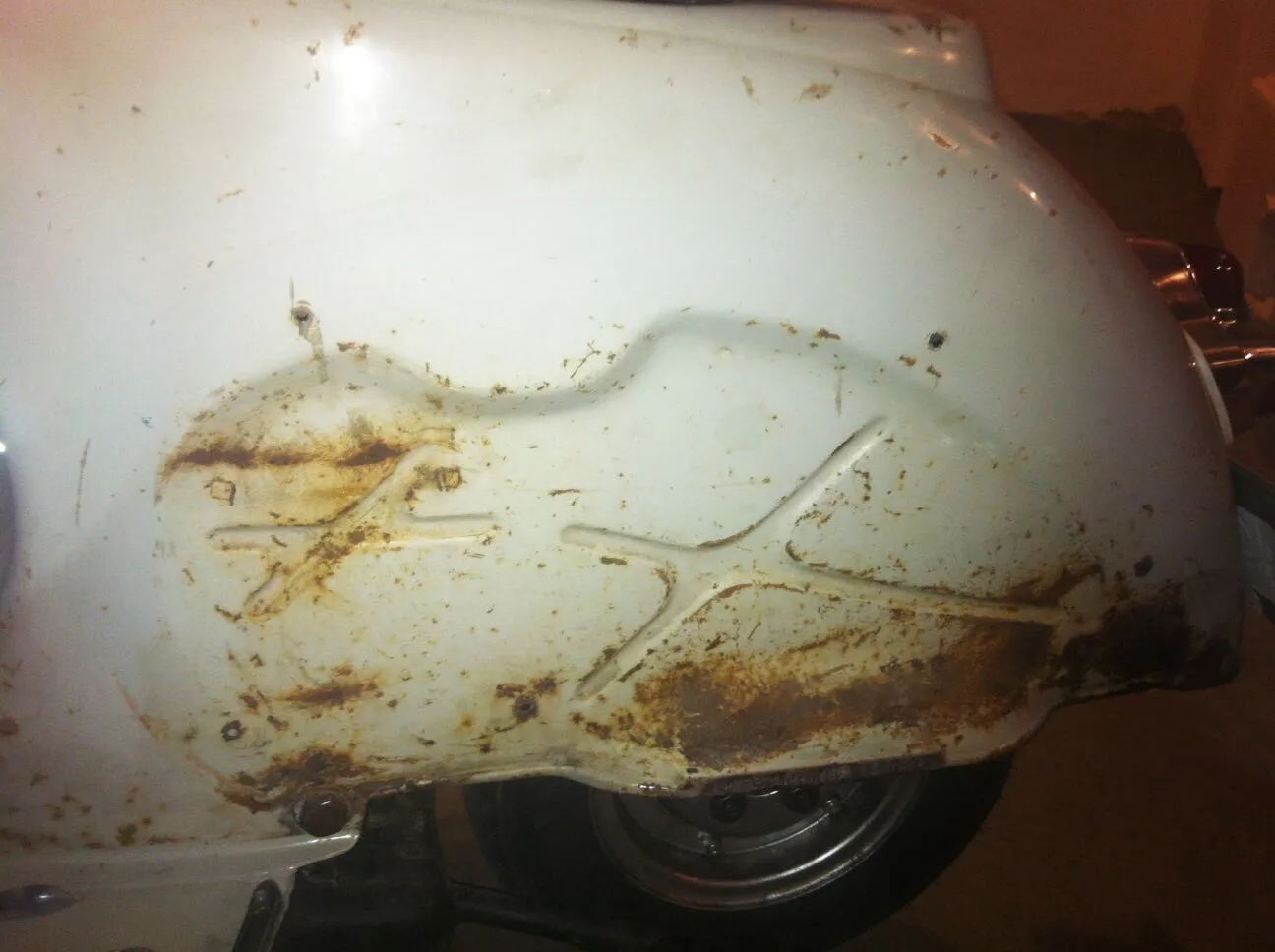 Abbau linke Backe, nur Oberflächenrost (keine Lächer), dann mit Pelox eingepinselt. Ergebnis nach dem Abwaschen war schon gut, heute folgt ein zweiter Durchgang (heute nur Fotos vom Handy)