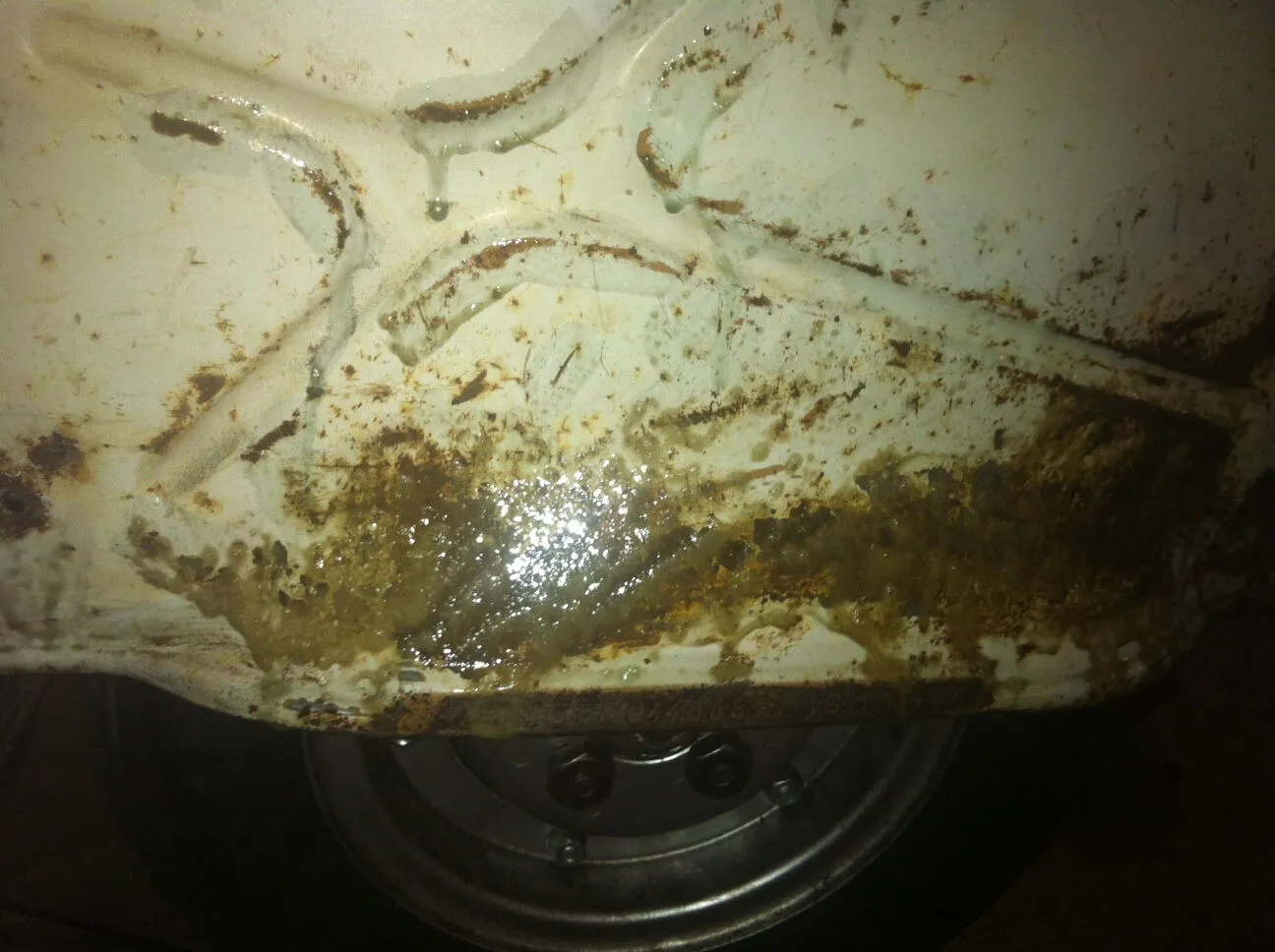 11.) Da der Tank schon ab war, habe ich mich auch gleich um die Falze und Hohlräume "im Hintern" gekümmert. Also nicht meine Hohlräume, sondern die der dicken Berta, kleiner Scherz am Rande :thumbup: Dafür habe ich Fluid Film genommen. die Meinungen gehen ja auseinander. Aber für den Hausgebrauch einfach zu verarbeiten, da man nicht wie mit Mike Sanders erst erhitzen muss und das ganze Zubehör wie Lanze, Kompressor usw. braucht. Obwohl sich meine Nachbarn sicher freuen würden ;)
