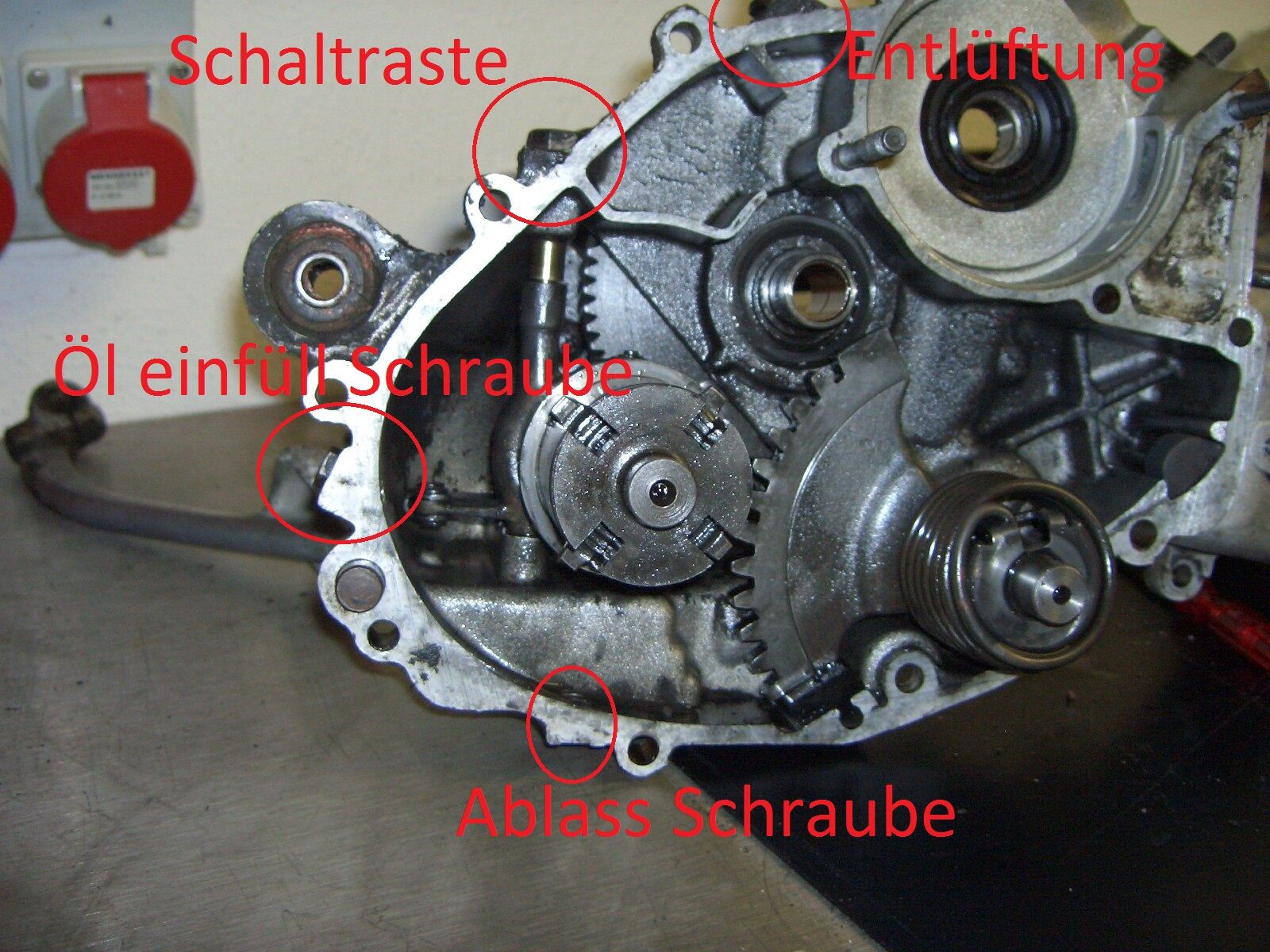 Das Bild hab ich schon betrachtet: bei "Schaltraste" , oben links im Bild hab ich 250ml Sae30 eingefüllt.