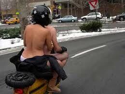Die Tatsache das die Frau recht spärlich gekleidet ist und sie dabei über dem Roller steht und nicht fährt. Ist ein weiter Hinweis doch bitte die richtige Kleidung zu tragen.....sonst würde die von der Natur vernachlässigte Frau doch drauf sitzen, oder?