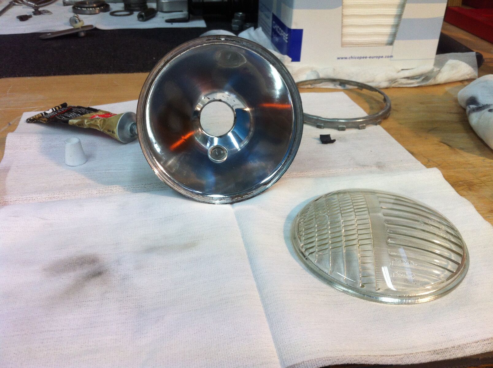 Reflektor und Glas mit Polierpaste auf Hochglanz poliert, so gut es ging.