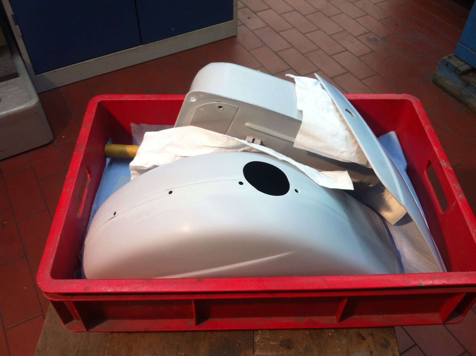 Heute den fertig gefüllerten Rahmen mit Anbauteilen vom Lackierer geholt, jetzt wieder schleifen bis 3M Superfine nass...
