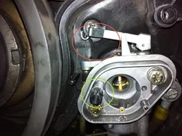 habe meinen Vergaser gefunden. ich hab an dem ding im roten kreis versucht den Draht hineinzuschieben, wenn ich den Choke herausziehe bleib der Draht unten. bin ich überhaupt an der richtigen stelle?