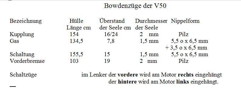 • Hi, wenn Du original Piaggio kaufst, passen die, aber alle anderen "Universalsätze" müssen angepasst werden. Eine von den beiden Endkappen sollte lose aufgesteckt sein. Beim Gaszug nehme ich den, wo der kleine Nippel am Gaser dran ist. Dann anpassen und oben löte ich den Nippel an. Die Zughüllen kürze ich mit einer Trennscheibe auf dem Dremel, ebenso die Innenzüge. An der Trennstelle verlöte ich den Zug und schreide dann mittendurch. Dadurch ribbelt der sich nicht auf. Das Fetten der Züge nicht vergessen, bei normalen Öl bei Teflon spezielles Teflon Öl. Auf keinen Fall mineralisches verwenden, dann quillt die Beschichtung auf.