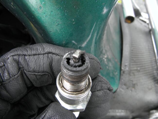 Nach ~20km Fahrt (Stadt/Landstraße) ging der Hobel an der Ampel einfach aus. Ursache: Zündkerze geschmolzen (siehe Bilder). Der Motor hat sich nicht gefressen (Kolben lege ich heute Nachmittag noch frei wg. evtl. Klemmspuren).