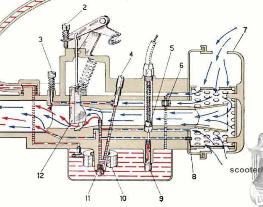 Meine Vespa PV125 startet nicht mehr. Ich hab den Vergaser (dell'Orto SHB19.19) auseinandergebaut und einigen Ölschlunz entfernt. Aißerdem ist mir aufgefallen, dass die Messingteile etwas korrodiert sind. In der Schwimmerkammer gibt es eine Schraube, durch die laut einem Manual der Sprit zur Düse soll (Nr. 11 auf dem Bild). Stimmt das so? Weil bei mir ist diese Schraube zu. Ich weiss nicht genau ob von Korrosion oder normal. Innen im Gewinde ist eine Vertiefung aber selbst mit einer Nadel komm ich da nicht durch. Deshalb meine Frage: Muss da wirklich ein Loch in der Mitte der Schraube sein? Wenn ja, wie krieg ich das wieder auf? Ich hab schon mal mit einem 1mm Bohrer dran gekratzt aber wenn da ein Loch war, war es dünner als 1 mm. Deshalb hab ich mich nicht weiterbohren getraut.